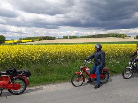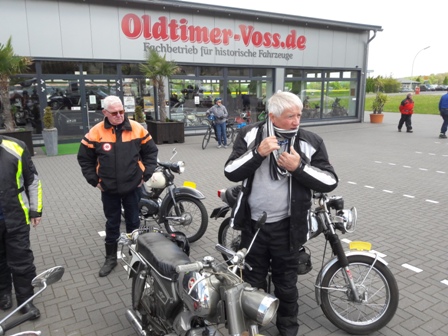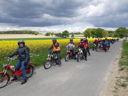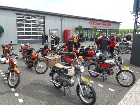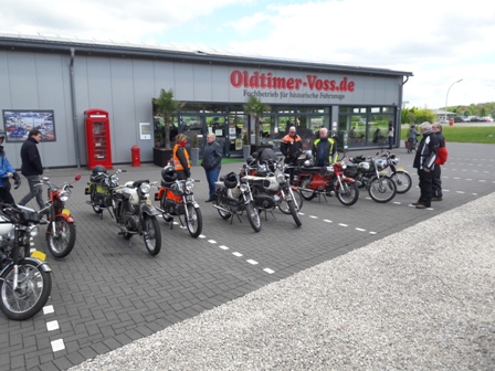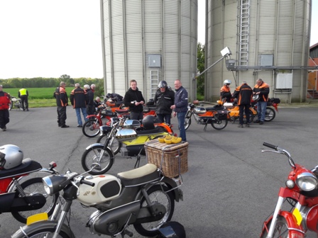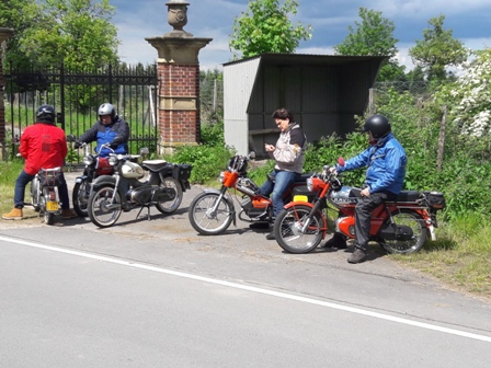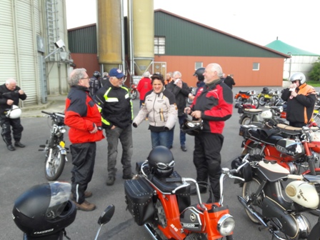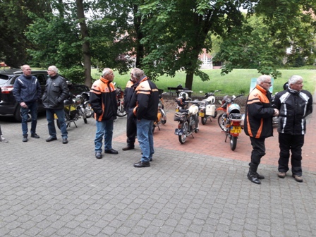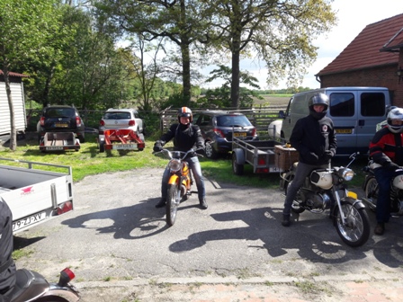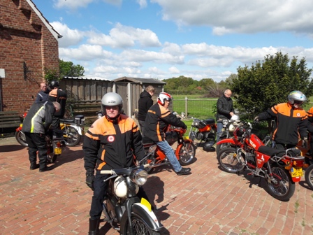 Toen we weer verder gingen bleek 1 van de Boldiek club een technisch mankement te hebben. Kortom, niet te veel stil gaan staan onderweg, dat geeft vaak het ene na het andere pechgeval. Maar ook dit was redelijk vlot opgelost en konden we toch weer verder. Er kwamen wel steeds meer wolken aan de lucht en hier en daar viel een drupje, maar het bleef toch droog. Toen we via binnenwegen in Ottenstein aan kwamen was het nog 5 kilometer tot aan de Lüntenerhof waar Ben en Jean ons weer opvingen en werden al snel de meeste brommers op de aanhangers geladen voor diegenen die van ver kwamen. We hebben nog even wat gedronken en Iedereen vond het nog al verbazingwekkend dat ik de hele route uit het hoofd wist en bedankten mij allemaal voor de mooie rit. Zelf vind ik dit niet echt bijzonder maar wel fijn dat iedereen het naar zijn of haar zin heeft gehad. We zijn om 16:30 weer naar huis gereden.