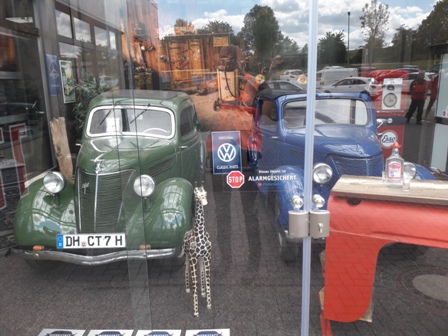 Na een minuut of 20 zijn we langzamerhand verder gereden en vanaf hier begon het landschap ook langzaam iets glooiender te worden. Hier en daar een bloeiend koolzaad veld en de zon scheen, dus het was gewoon prachtig. We reden naar Osterwick en van daar uit naar Darfeld. Tot nu toe geen technische problemen, en we waren rond 12:05 in Darfeld. We zijn toen eerst even naar de oldtimergarage Voss gereden. Deze garage en showroom was weliswaar gesloten, maar door de ramen is er alleen al genoeg te zien voor ons als oldtimer liefhebbers. Na 20 minuten ook hier weer verder gereden zodat we ook 12:30 bij Hotel restaurant Feldkamp aankwamen, waar we wat konden eten. Hier stond een buffetje klaar. Iedereen at er goed van, en volgens mij heeft iedereen wel genoeg gehad. Ik persoonlijk wel jammer dat er geen groente bij zat, maar goed echt een probleem was het volgens mij ook niet voor de meeste mensen onder ons.