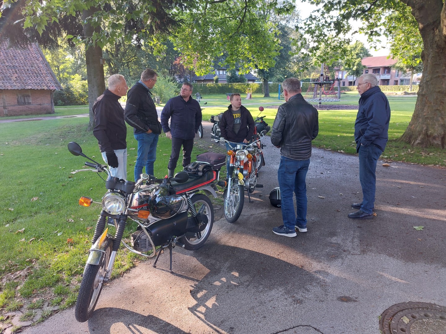 Het is een schitterend dorpspark waar het riviertje de Berkel door heen stroomt. Enkelen van ons kwamen nog aan de praat over onze brommers met een paar parkbezoekers. Door Han Ordelmans werden we nog op iets lekkers getrakteerd. We zij er zo’n drie kwartier gebleven en hebben toen onze brommers weer aangetrapt. We reden richting Oldenkotte.
