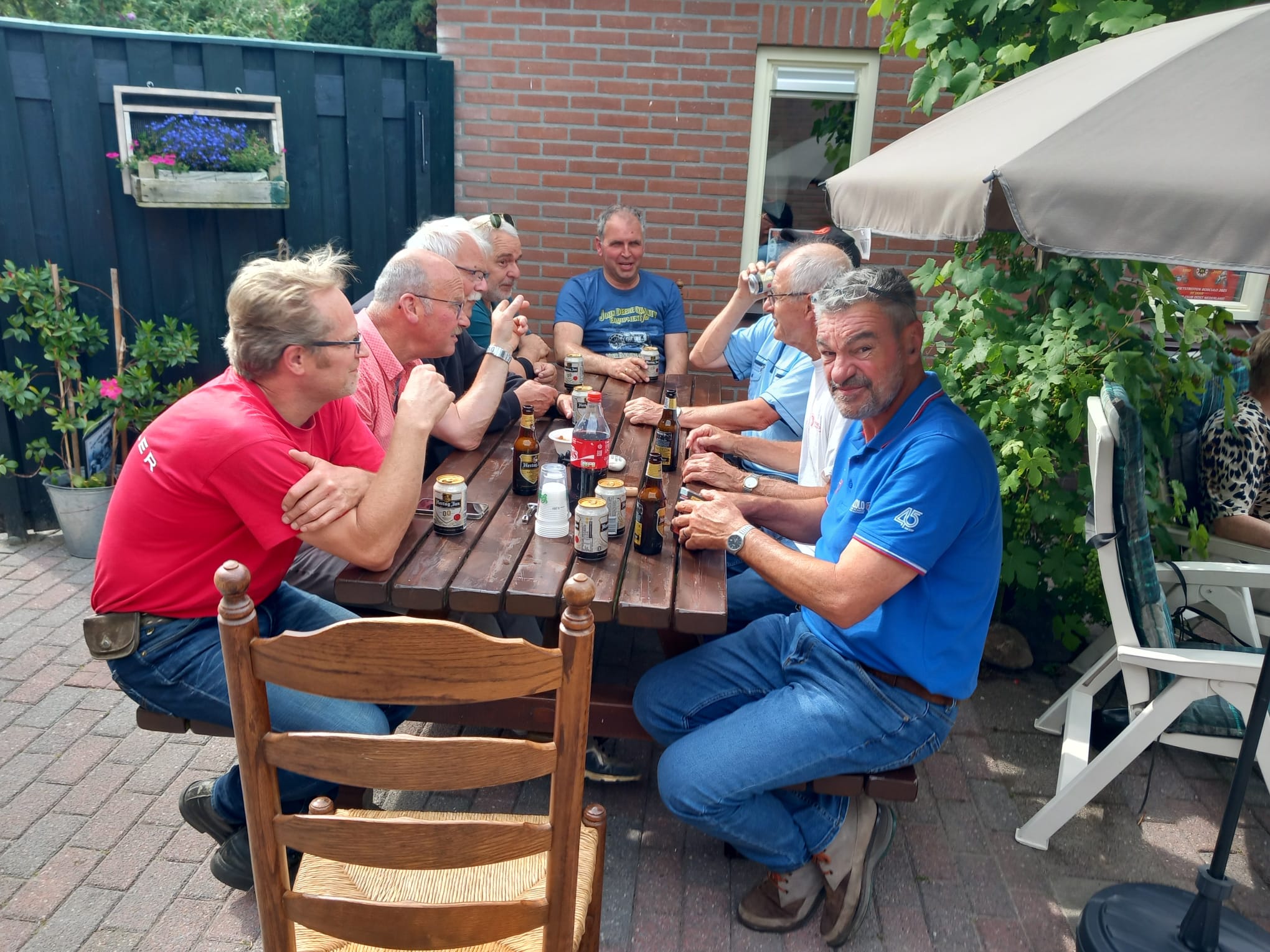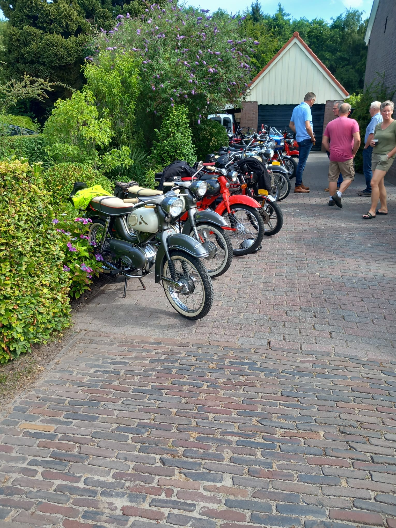 Zaterdag ochtend 12 juli om 08:00 uur zijn we met de auto meet aanhanger vertrokken naar Veenhuizen (Drenthe). We zijn vanuit Haaksbergen vertrokken met 3 auto’s, en in Beckum hebben we Harry en Lidy Veldhuis nog even opgepikt, en die zijn ook aangehaakt. Met 4 auto’s variërend met fietsen en brommers achter op, in 1 stoet richting Drenthe. Dat liep allemaal super voorspoedig, en omstreeks kwart voor 10 kwamen we aan Bij het huis adres van Alwin en Karla Meijer. We hebben de brommers en fietsen afgeladen en achter het huis van Alwin en Karla stond koffie met krenteweggen en cake klaar. We hebben even heerlijk in de mooie tuin van familie Meijer gezeten, en omdat er een groep van 2300 wielrenners precies op het tijdstip dat we wilden gaan vertrekken door de straat zou komen, zijn we 10 minuten voor 11 uur vertrokken aan de toertocht.