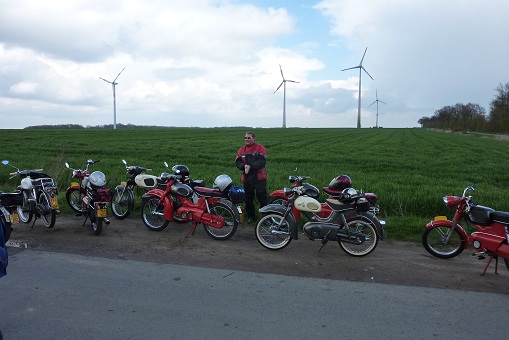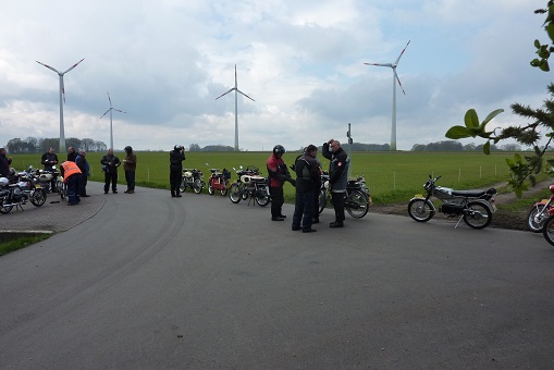 We zijn naar Eibergen gereden en via Rekken in Oldenkotte de Nederlands / Duitse grens over gegaan. In Duitsland hebben we zoveel mogelijk kleine weggetjes gereden en via Lünten naar Graes en Ahle gereden. Het weer was nog steeds goed en de Kreidlers liepen allemaal prima waardoor ik ongeveer een snelheid van 50 km/uur kon rijden. Na 40 kilometer zijn we maar even gestopt om even te vragen of alles goed ging bij iedereen en even een plakje brood te eten.