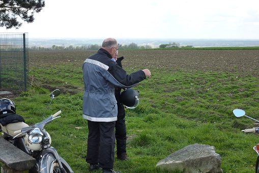 We kwamen langzamerhand in een iets heuveliger gebied en daaraan konden we merken dat de Schöppinger berg niet ver meer was. Om ongeveer 12 uur waren we in Schöppingen en daar gingen we links af de berg op. Ik zag in de spiegel verschillende Kreidlers kleiner worden maar de blauwe rookpluim werd alleen maar groter. Er moest even 1 of 2 keer terug geschakeld worden om naar boven te komen maar iedereen kwam goed boven. De een wat sneller dan de ander, maar dat maakt natuurlijk niets uit. Boven op de berg hebben we weer even een korte pauze bij de uitkijkpost gemaakt om wat plaatjes te schieten.