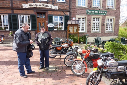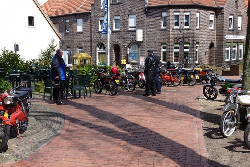 We kregen langzamerhand honger dus zijn we na zo'n 20 minuten weer verder gereden. Toen kregen we een mooie route over de kleine en steile weggetjes op de Schöppinger berg. Wederom waren de rookpluimen goed zichtbaar en iedereen kon even testen of de Kreidler helemaal klaar is voor het weekend naar de Eifel dat half mei gepland staat of de rit naar het Teutoburger wald dat eind augustus op de agenda staat. We zijn via Schöppingen naar het oude plaatsje Asbeck gereden waar ik een restaurant besproken had om wat te eten.