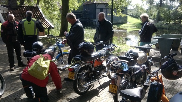 Na de koffie hebben wij een uitgebreide eerste tourrit gedaan, grofweg; rondom Haaksbergen, tegen de klok in. Via Buurse, het Rutbeek (langs de villa Zonnebeek, een ontwerp van G.J. Beltman), Veldmaat, Isidorushoeve naar de Oostendorper Watermolen ten zuiden van Haaksbergen. Hier zijn wij even afgestapt van onze Kreidlers om de omgeving te genieten en Johan de kans te geven voor zijn jaarlijkse groepsfoto. Bij de watermolen was ook een groep motorrijdsters; allemaal dames. Dit was hun jaarlijkse motoruitstapje, zonder de mannen. De mannen rijden altijd te hard en dames moeten te vaak plassen, is ons als excuus vertelt.