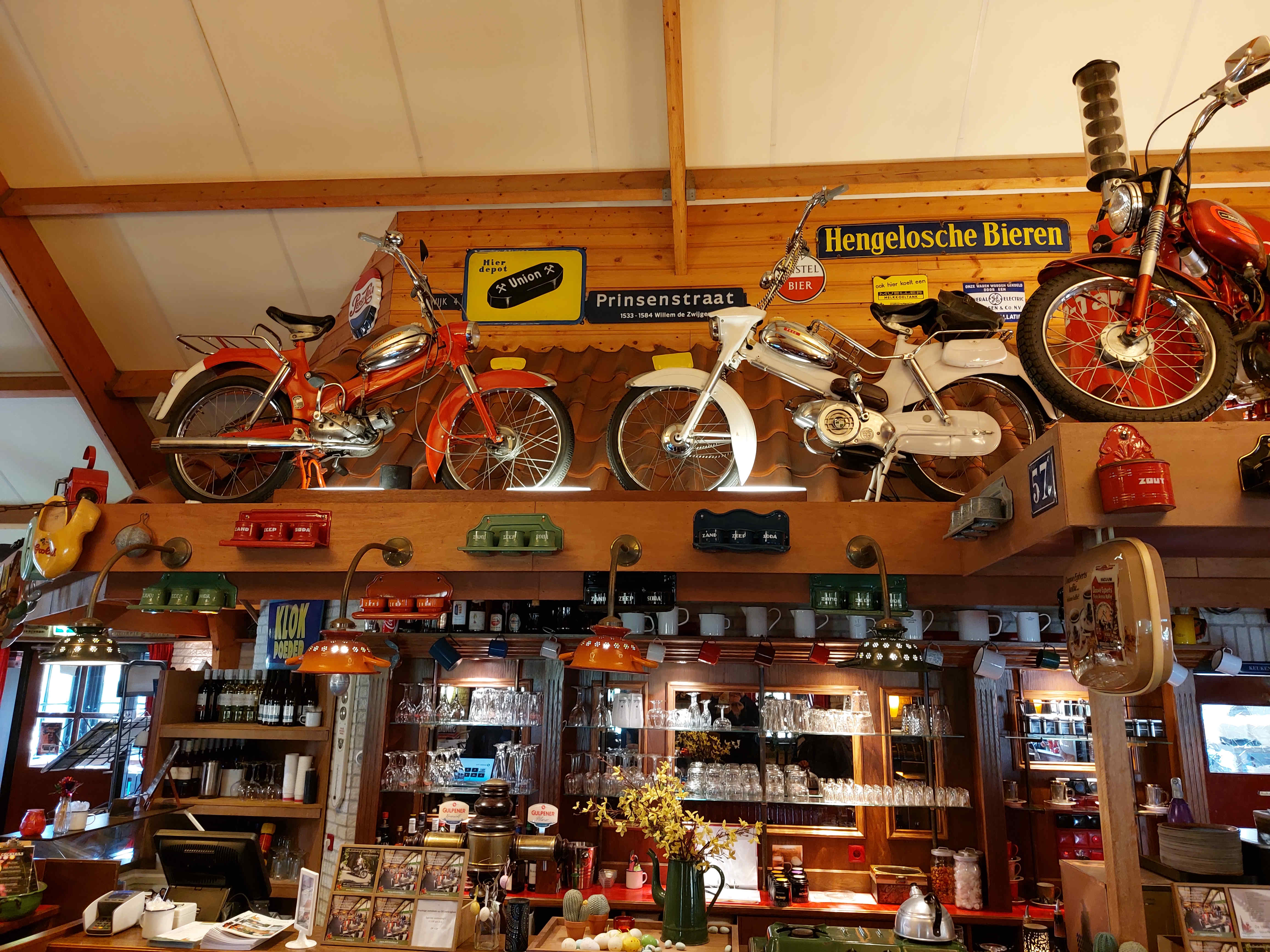 We namen plaats in het restaurant. De eigenaar was een beetje verbaast dat we maar met 15 mensen waren, hij had er meer verwacht. Maar het mocht de pret niet drukken. Peter had een arrangement geregeld en daar hoorde ook een bezoek aan het bromfiets museum bij. Dat was (althans voor mij) een verrassing.