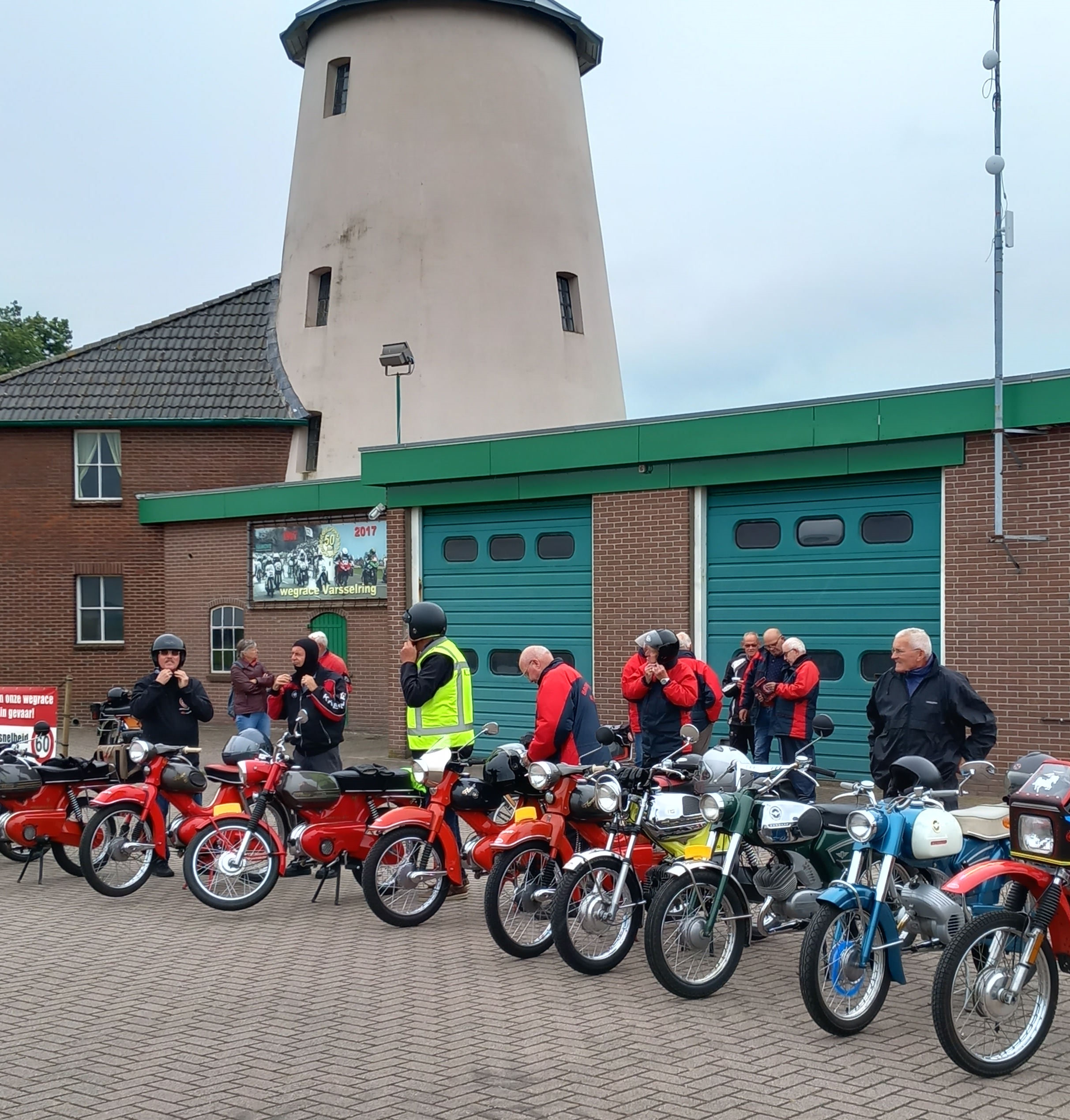 Gaandeweg kwamen er meer mensen bij, het meest met een Kreidler, een enkeling met een Zündapp. Ondanks het bewolkte weer en de kans op een buitje, waren er uiteindelijk toch nog 24 deelnemers aan deze tourtocht. Met Frans Siemerink als voorrijder en Peter Schoenmakers als achter rijder, zijn wij in zuidelijke richting vertrokken in de richting van Mariënvelde.