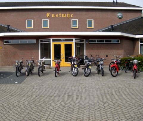 Na een gezellige avond en een goede nachtrust vertrokken wij zondagmorgen om 09.00 uur richting Driebruggen. Tegen 10.00 uur arriveerden wij bij het dorpshuis waar al een aantal brommers geparkeerd stonden. Na 2 bakjes koffie vertrokken wij tegen 11.00 uur met 13 personen. Hiervan reden er 11 op een Kreidler en 2 op een ander merk bromfiets.