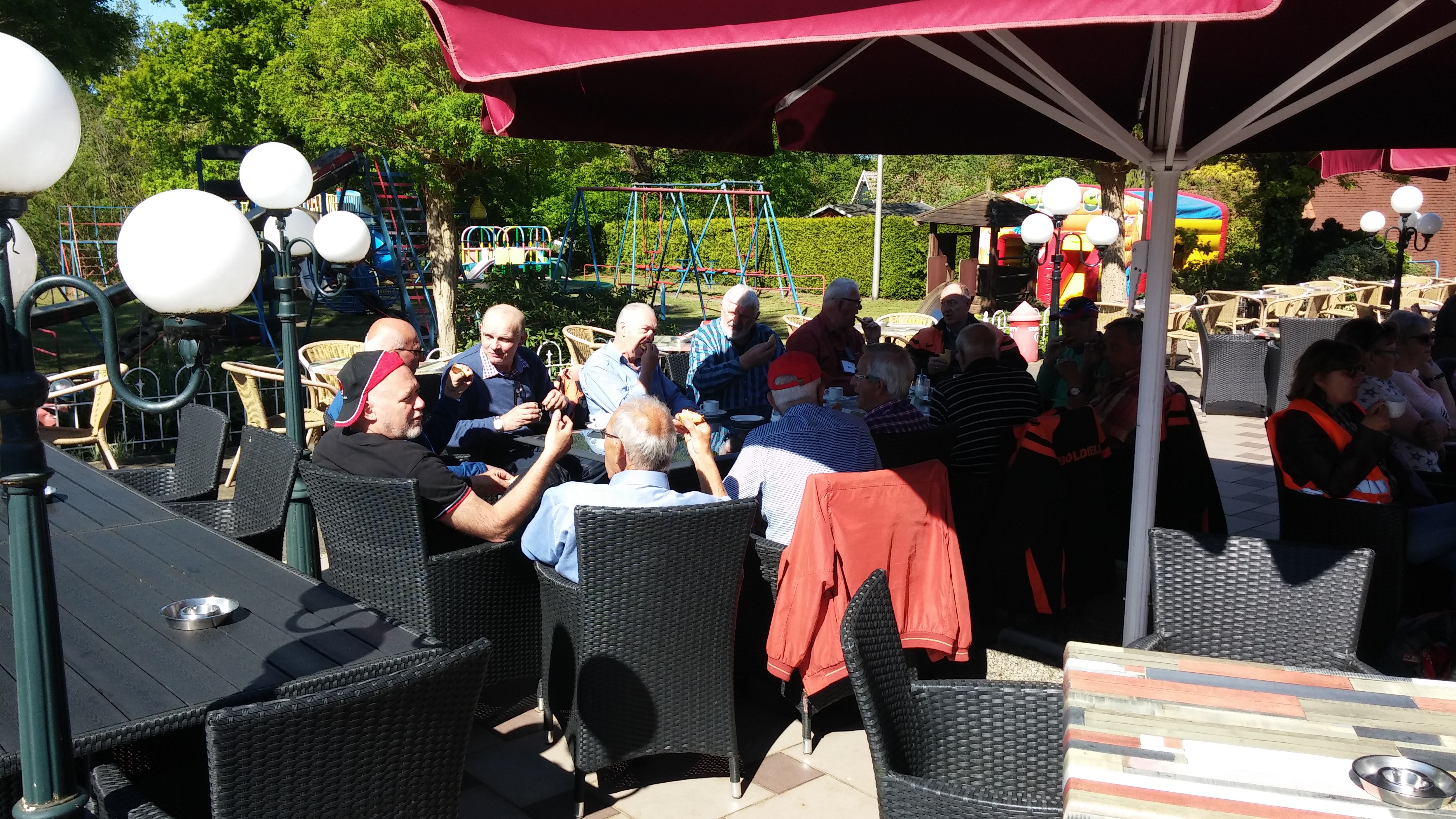 Markerink (en hun familie) met koek en zopie. Op dit plein is elke eerste zondag van de maand een oldtimermeeting. (Hoofdzakelijk auto’s).
