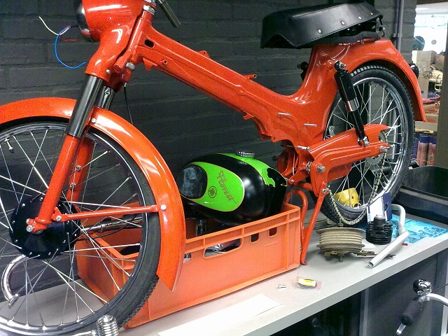 Met dank voor de rondleiding in de showroom en werkplaats en een kijkje in het bromfietsmuseum op de zolder, kan hij het eindresultaat ook mooi laten zien op ons aanstaande Kreidlertreffen.
