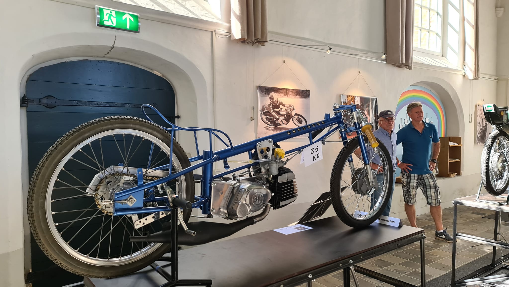 Toen ik bij de Karke aankwam en binnen keek vielen mij de schellen van de ogen. Ge-wel-dig !! Prachtig dit had ik niet verwacht. !! Op het koor (voorste gedeelte in een kerk) stonden diverse modellen van Kreidler en in de gangpaden al dan niet op een verhoging diverse specials. Ook de promostand van onze club stond in een gang pad opgesteld. Langs de wanden was een ophangsysteem aanwezig waar aan diverse afbeeldingen met Kreidler onderwerpen waren opgehangen.