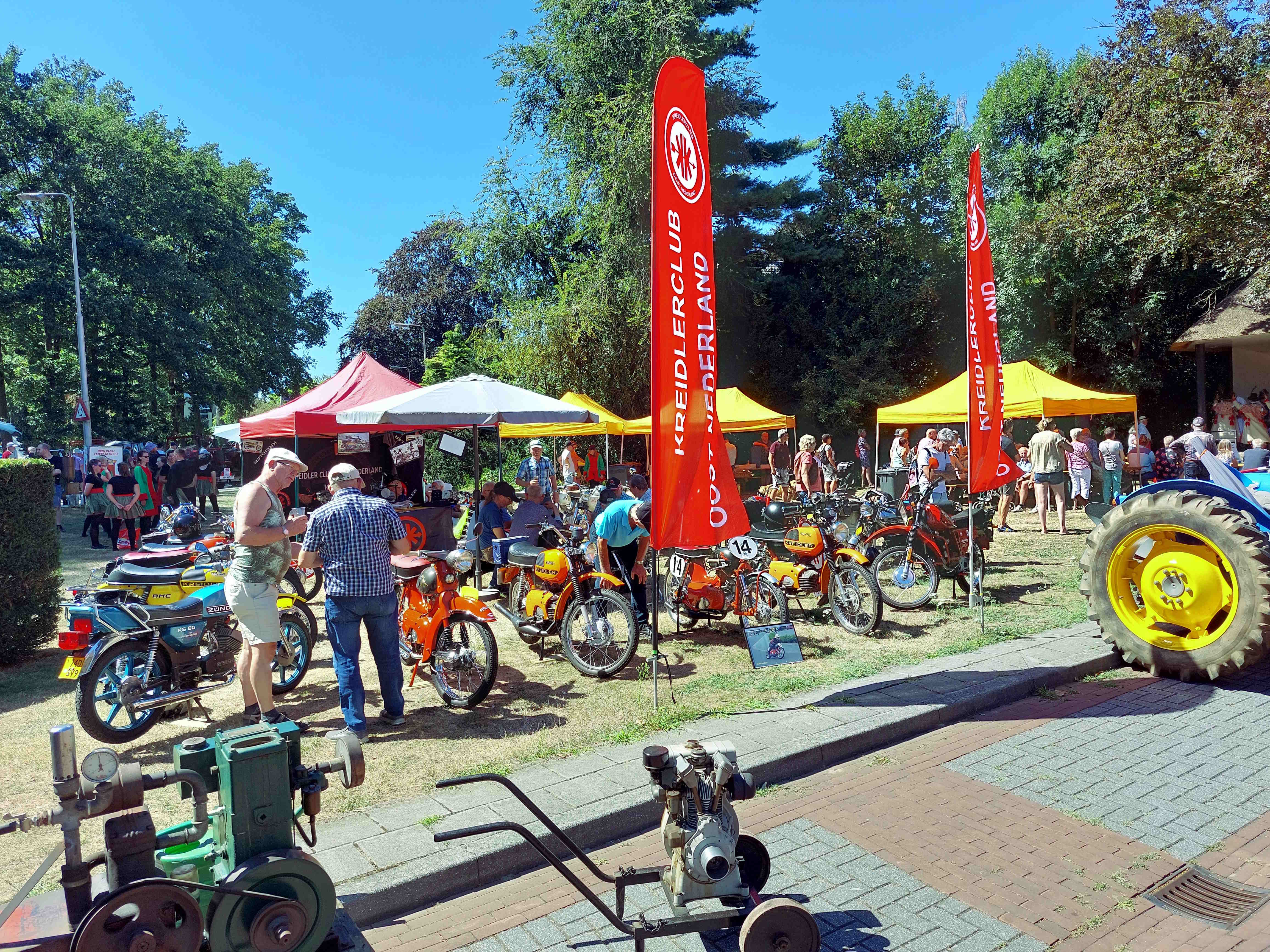De Reurlse Zommerdagen zijn een vijfdaags evenement met afwisselend muziek, dans, een oecumenische kerkdienst, een brandweermiddag voor de jeugd, een boerderijenfietstocht, een korenavond, een grote braderie, internationale folklore en een oldtimershow van tractoren, werktuigen, stationaire motoren en sinds een aantal jaren ook bromfietsen, speciaal Kreidler. Genoeg te doen dus. De organisatie van de Zommerdagen heeft Peter Schoenmakers een aantal jaren geleden gevraagd of de KCON ook medewerking aan het evenement kon verlenen. Dat is dus gelukt. Peter is al enkele jaren de organisator van het Kreidler gebeuren op de Reurlse Zommerdagen. Ik ben er dit jaar ook naar toe geweest. Het weer was uitstekend, zeer zonnig en warm om niet te zeggen heet. De aanvangstijd was zo rond 12.00 uur. Om 11.00 uur ben ik vertrokken. Na anderhalve km rij ik een fietstunneltje bij Nijverdal uit: Halt politie. Ik denk, wat nou weer. Maar het was een storm in een glas water. Ze visten naar jeugd met opgevoerde scooters en brommers. Ik moest mijn rij en kentekenbewijs laten zien en een keer aan het gas draaien. Oom agent: Het lijkt me dat alles in orde is. (Dat is ook zo). Een goede reis kreeg ik toegewenst na zijn vraag waar ik naar toe ging. Om 12.15 was ik in Ruurlo. Na de brommer gestald te hebben kreeg ik consumptie bonnen aangeboden als blijk van waardering voor de medewerking. Op het terrein was onze promotie stand ook weer ingericht met diverse attributen: opengewerkte motorblokken, te koop aangeboden onderdelen en kleding enz. van onze promo shop.