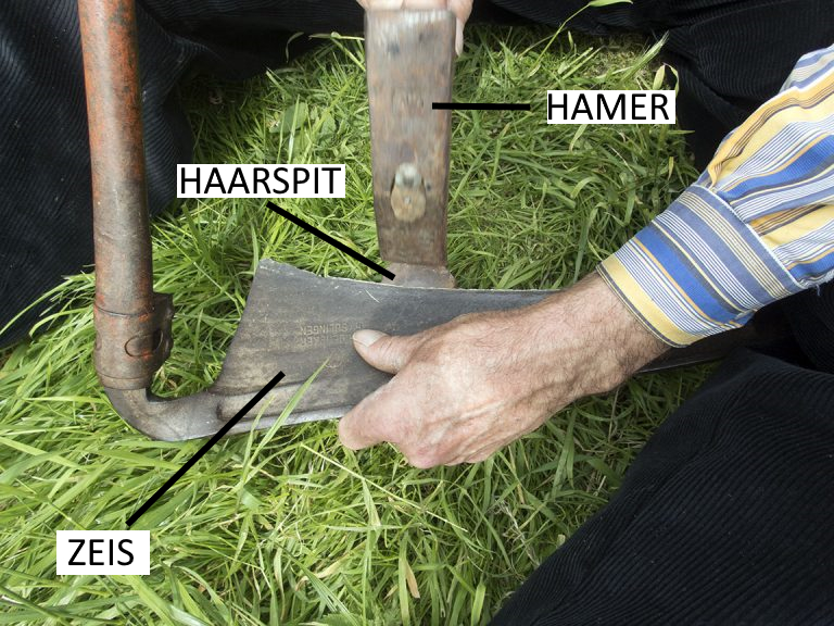Het was reuze gezellig en heb leuke praatjes gemaakt met diverse mensen. Op de braderie viel ook van alles te zien : Manden maken, een zeis of een zicht haren (aanscherpen), Knipmutsen maken, schilderkunsten op aardewerk, stoelen matten, enz. Het haren (aanscherpen) van een zeis. Met een hamer wordt de zeis welke op het haarspit ligt uitgeklopt waardoor het materiaal van de zeis dunner wordt en er een scherpe rand ontstaat. Deze scherpe rand wordt nabewerkt door met een z.g. wetsteen langs de gehaarde rand te strijken waar door de zeis echt scherp wordt.