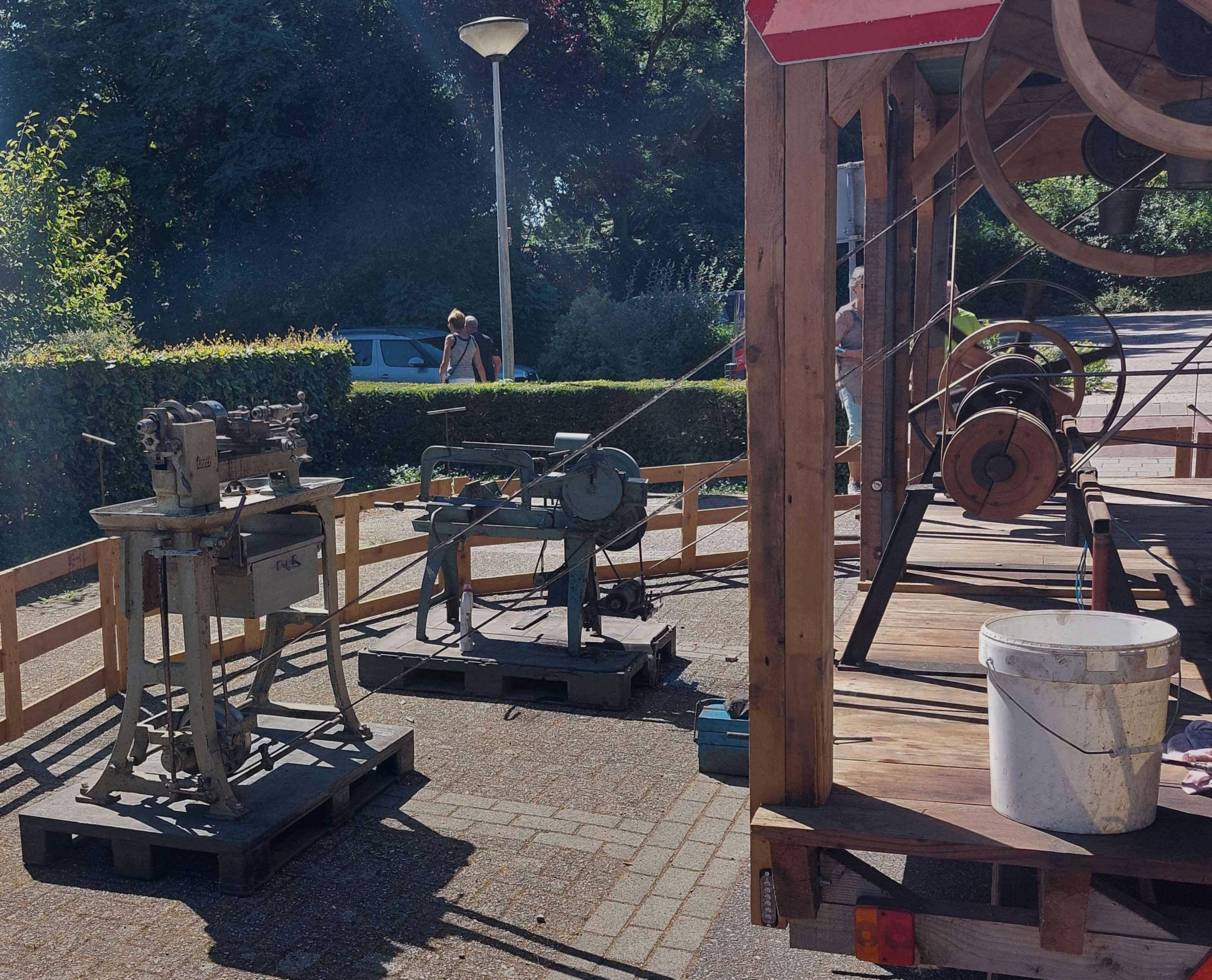 Ook stond er een schitterende eigenbouw opstelling van machines met een centraal riemen drijfwerk zo als men dat vroeger in fabrieken en werkplaatsen had.