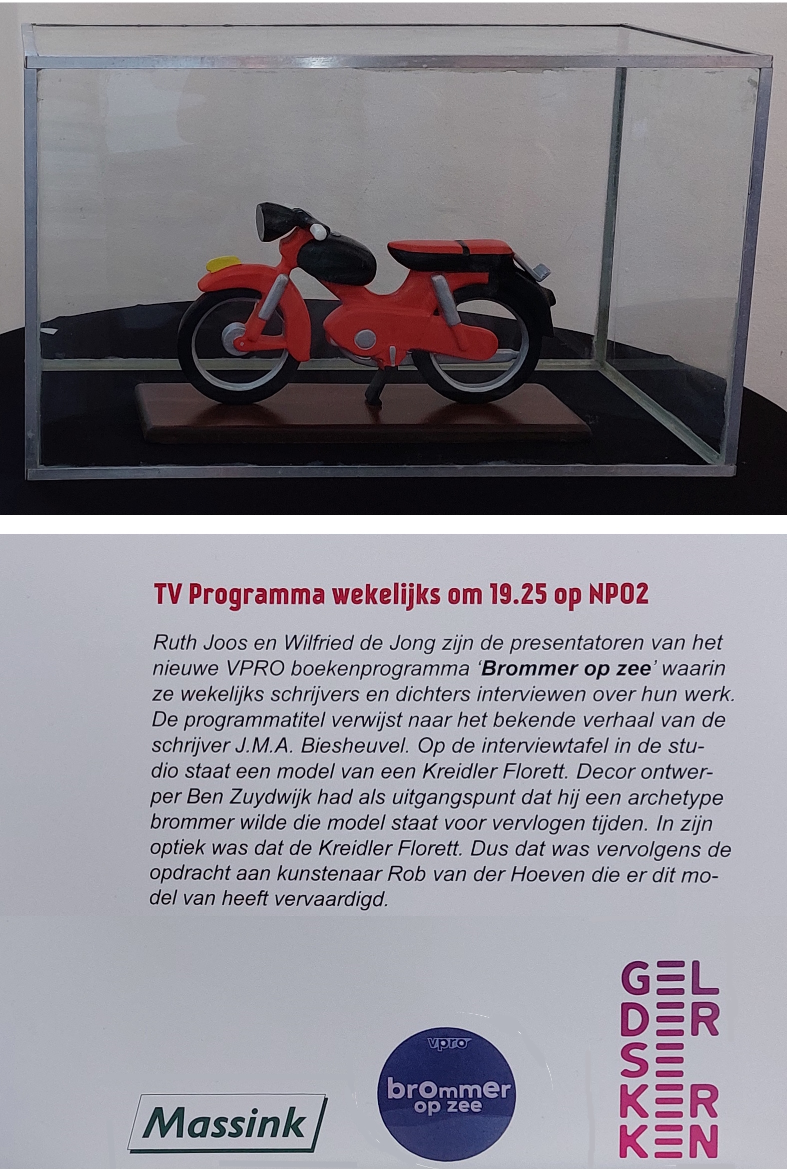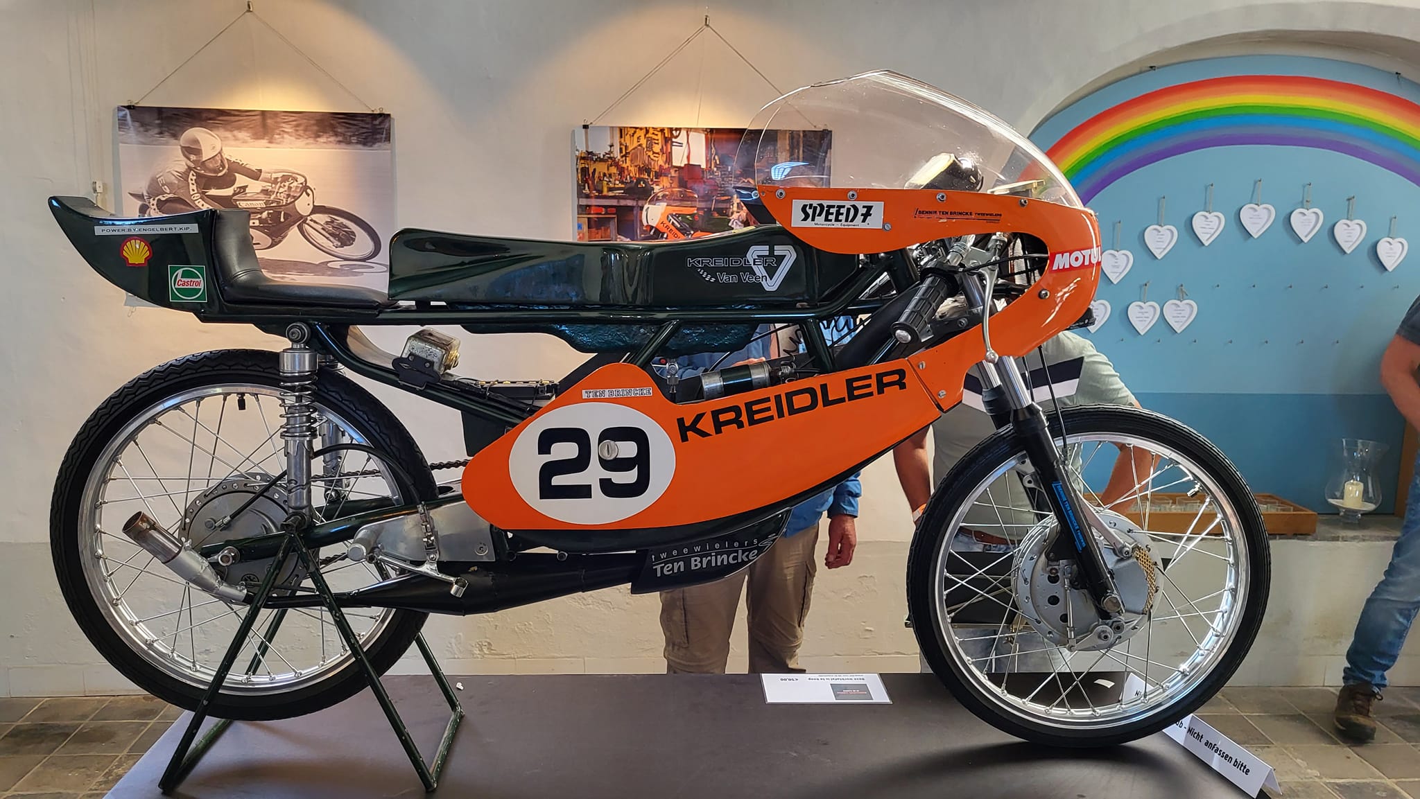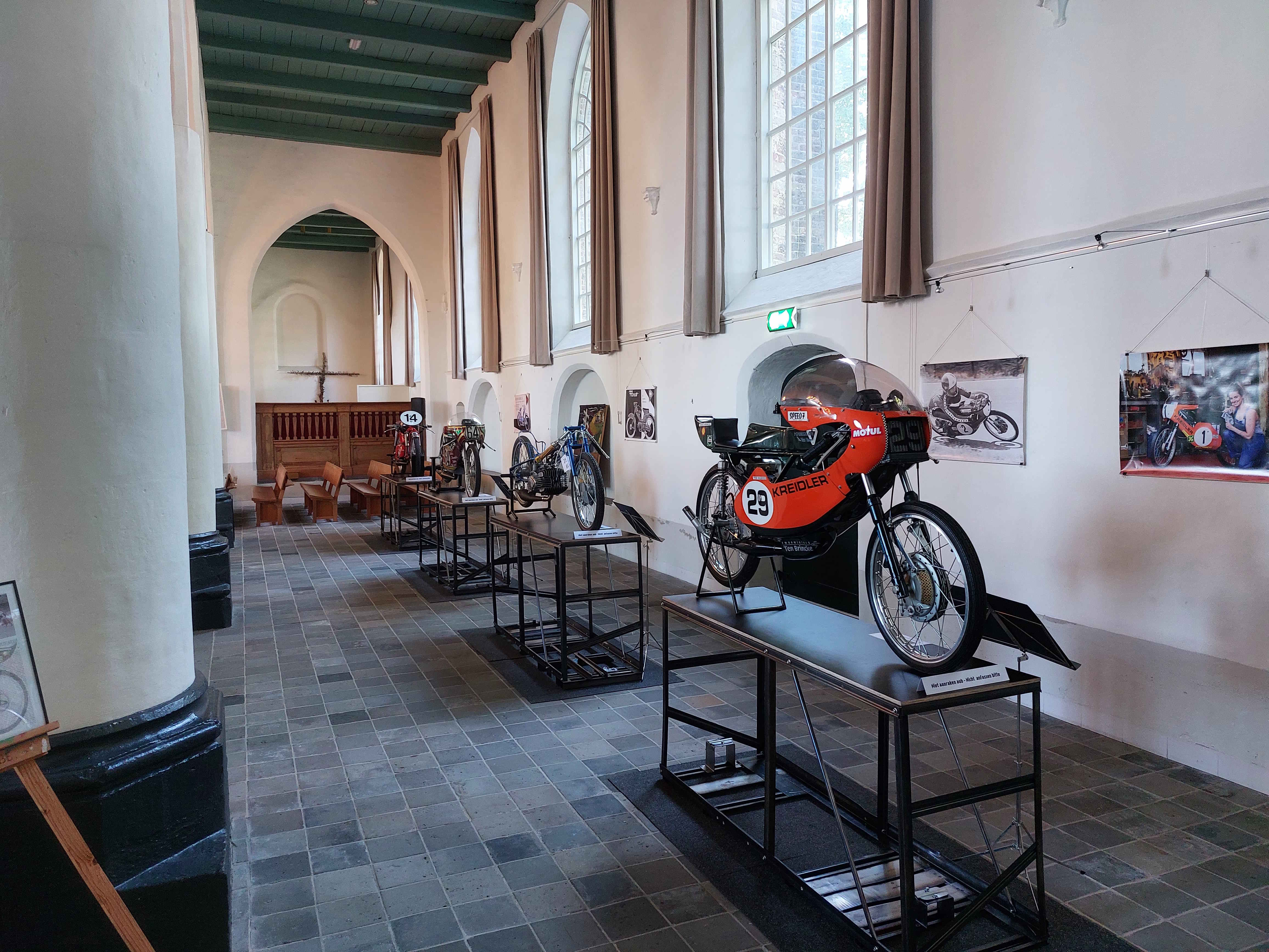 Toen ik bij de Karke aankwam en binnen keek vielen mij de schellen van de ogen. Ge-wel-dig !! Prachtig dit had ik niet verwacht. !! Op het koor (voorste gedeelte in een kerk) stonden diverse modellen van Kreidler en in de gangpaden al dan niet op een verhoging diverse specials. Ook de promostand van onze club stond in een gang pad opgesteld. Langs de wanden was een ophangsysteem aanwezig waar aan diverse afbeeldingen met Kreidler onderwerpen waren opgehangen.