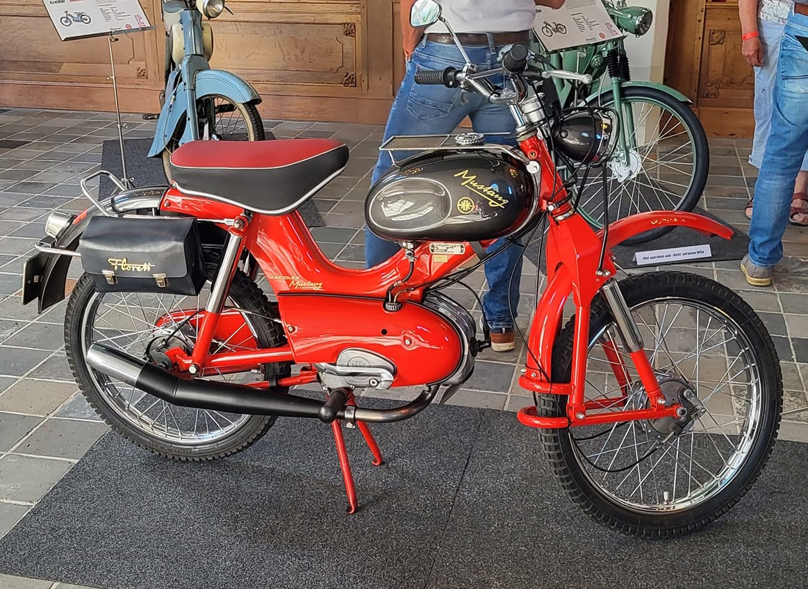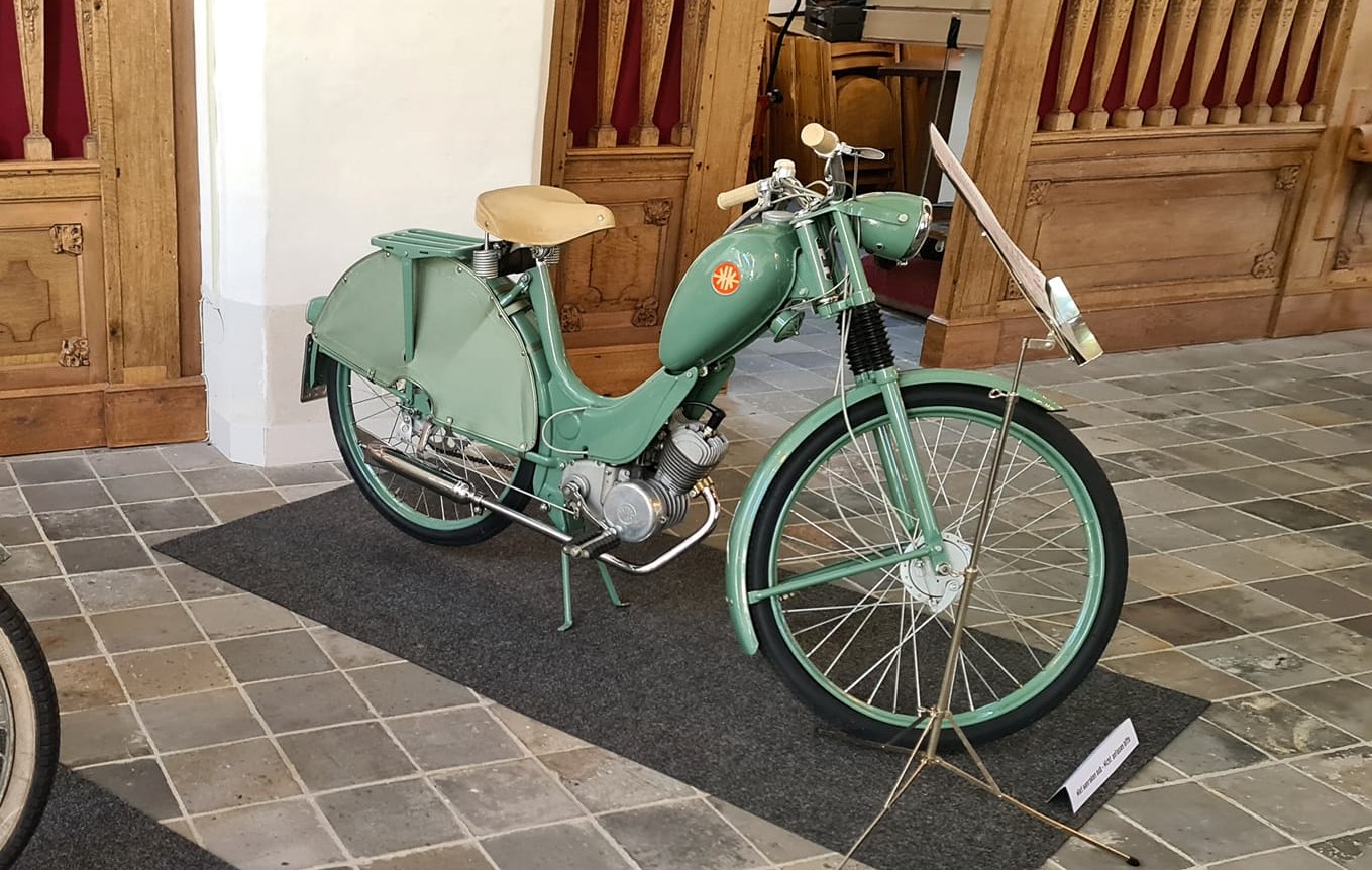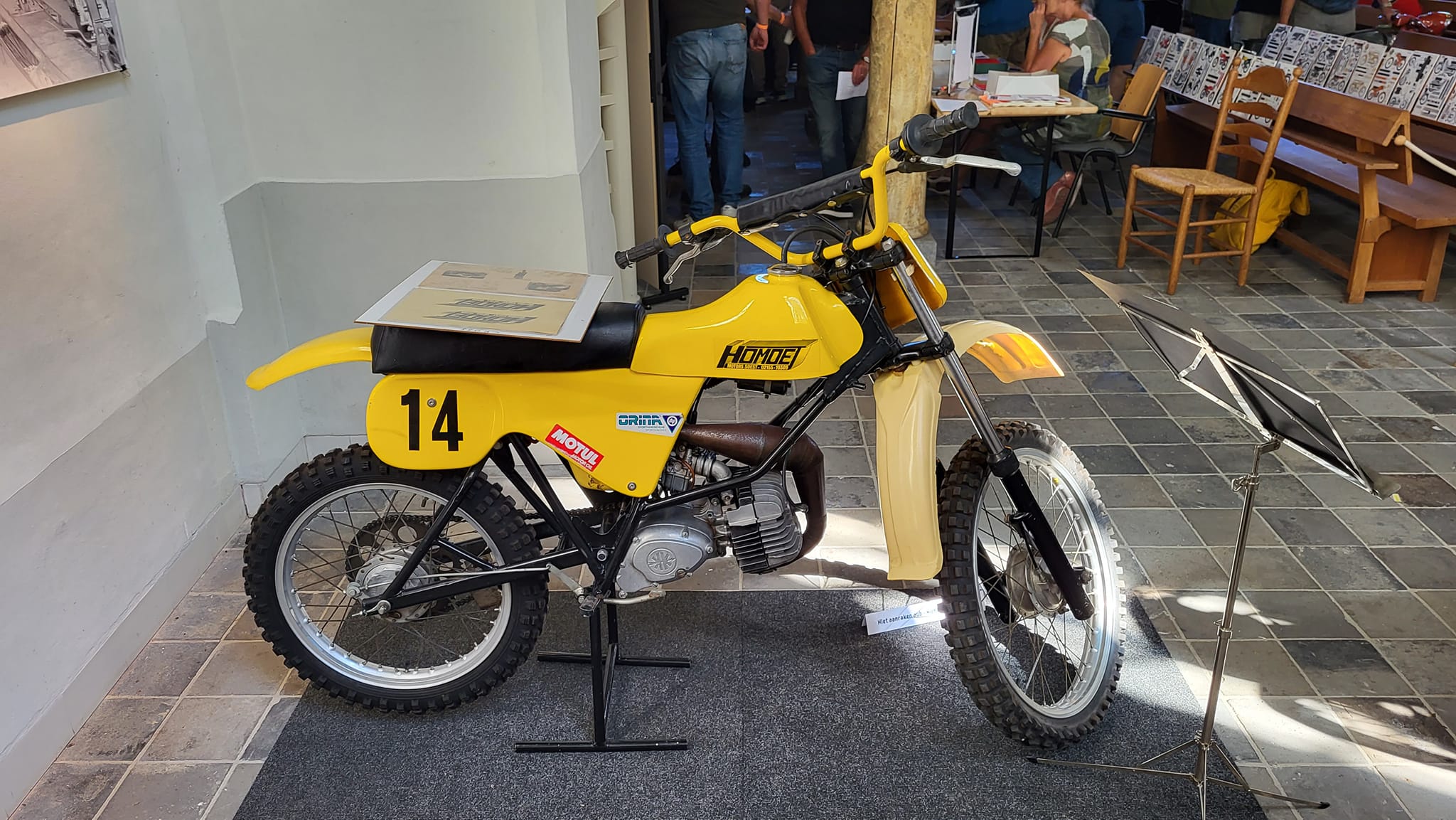 Toen ik bij de Karke aankwam en binnen keek vielen mij de schellen van de ogen. Ge-wel-dig !! Prachtig dit had ik niet verwacht. !! Op het koor (voorste gedeelte in een kerk) stonden diverse modellen van Kreidler en in de gangpaden al dan niet op een verhoging diverse specials. Ook de promostand van onze club stond in een gang pad opgesteld. Langs de wanden was een ophangsysteem aanwezig waar aan diverse afbeeldingen met Kreidler onderwerpen waren opgehangen.
