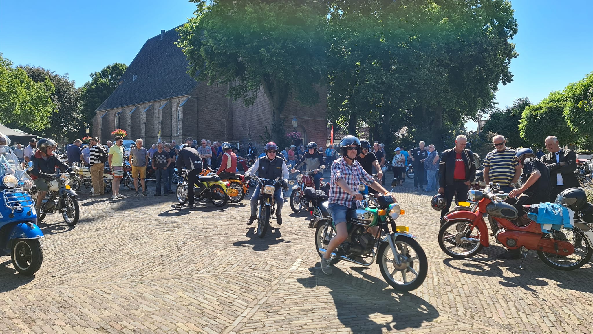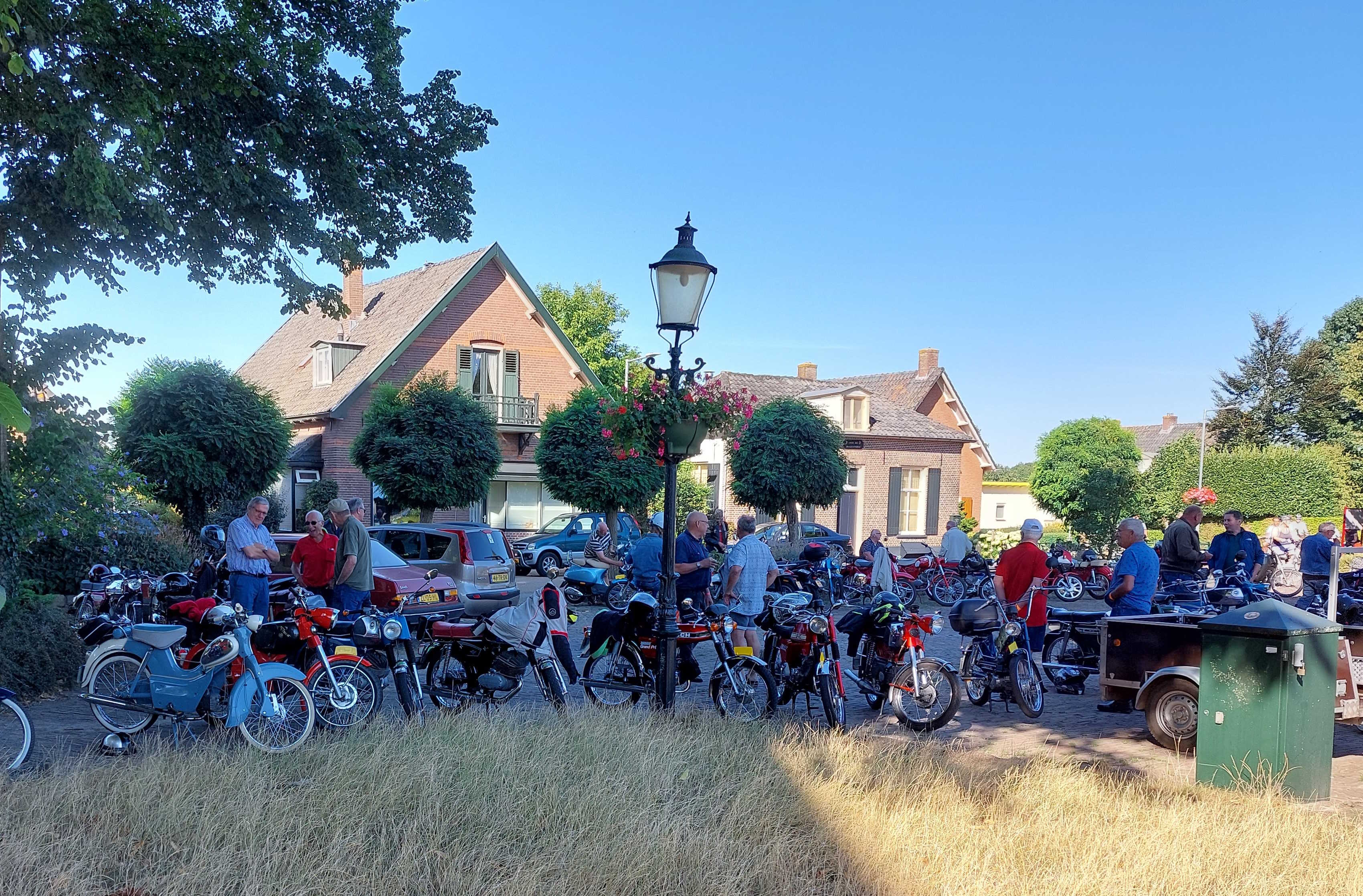 Pauze in Toldijk bij de firma Massink en weer terug naar de Remigiuskerk in Steenderen. Het was een mooie afwisselende rit door de prachtige omgeving. Ook ging de rit deels over zandfietspaden en zandwegen. Op deze paden en wegen was het oppassen geblazen dat door het mulle zand het stuur dwars kon slaan en je onderuit ging. Een nadeel van zandwegen is ook dat je brommer onder het stof komt te zitten maar daarover later meer. Bij Massink in Toldijk was de pauze. Massink is een handelaar/importeur in oldtimer bromfietsen (voornamelijk Zündapp) gewone bromfietsen, scooters, helmen, onderdelen en motorkleding.