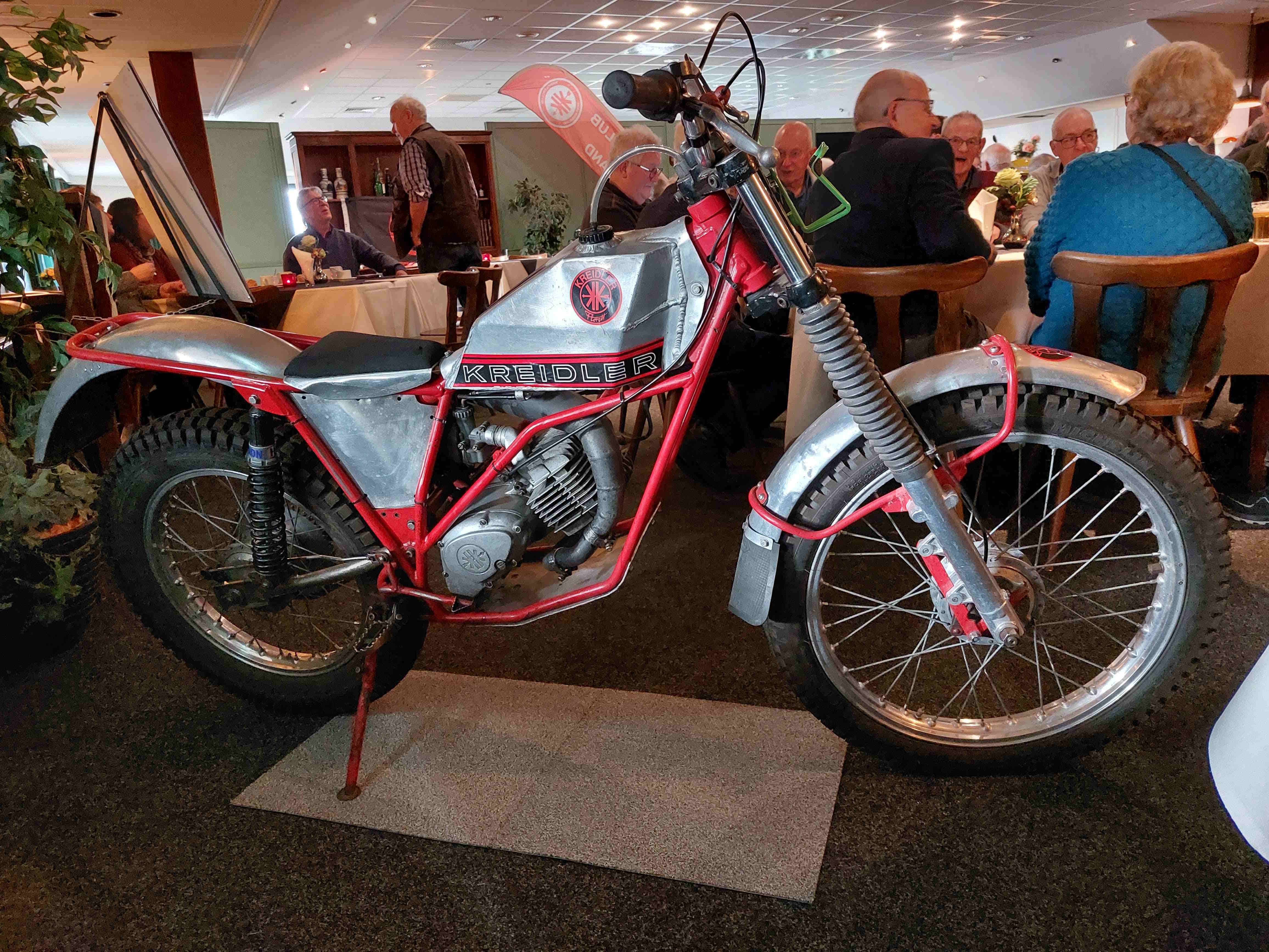 Via een van onze leden John Brendel werd er gevraagd of er een trial Kreidler uitgestald mocht worden in de zaal. Deze was door meneer Gijs van Woerkom zelf gebouwd en was een prachtige aanwinst. (in een volgende editie meer over deze trial