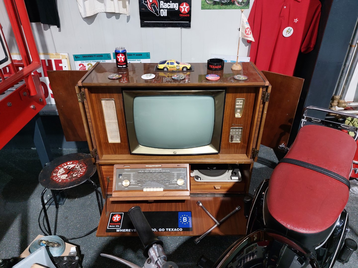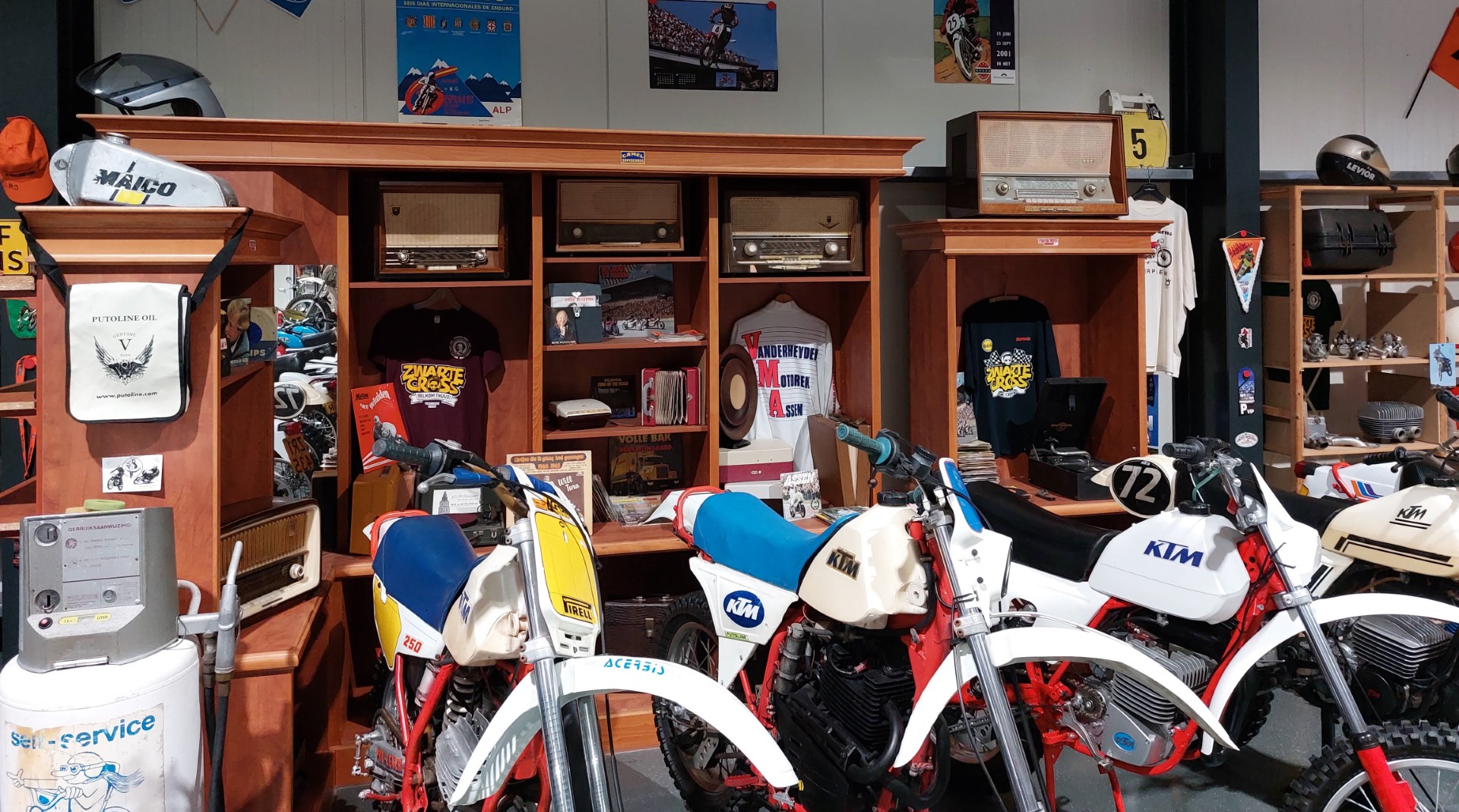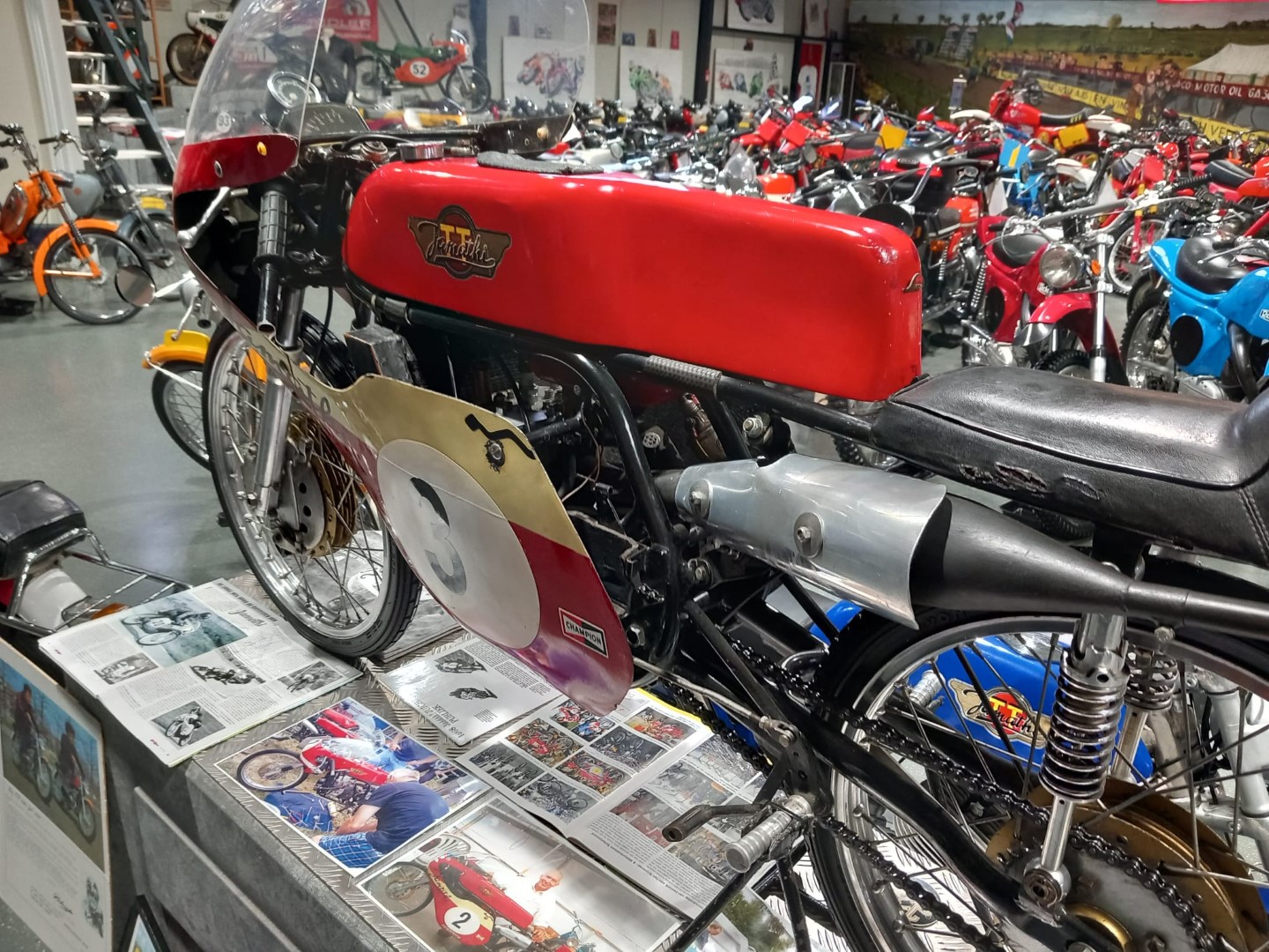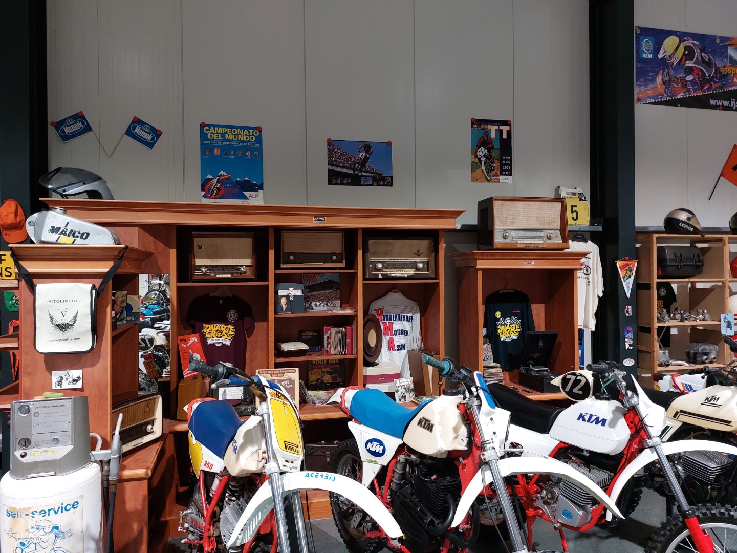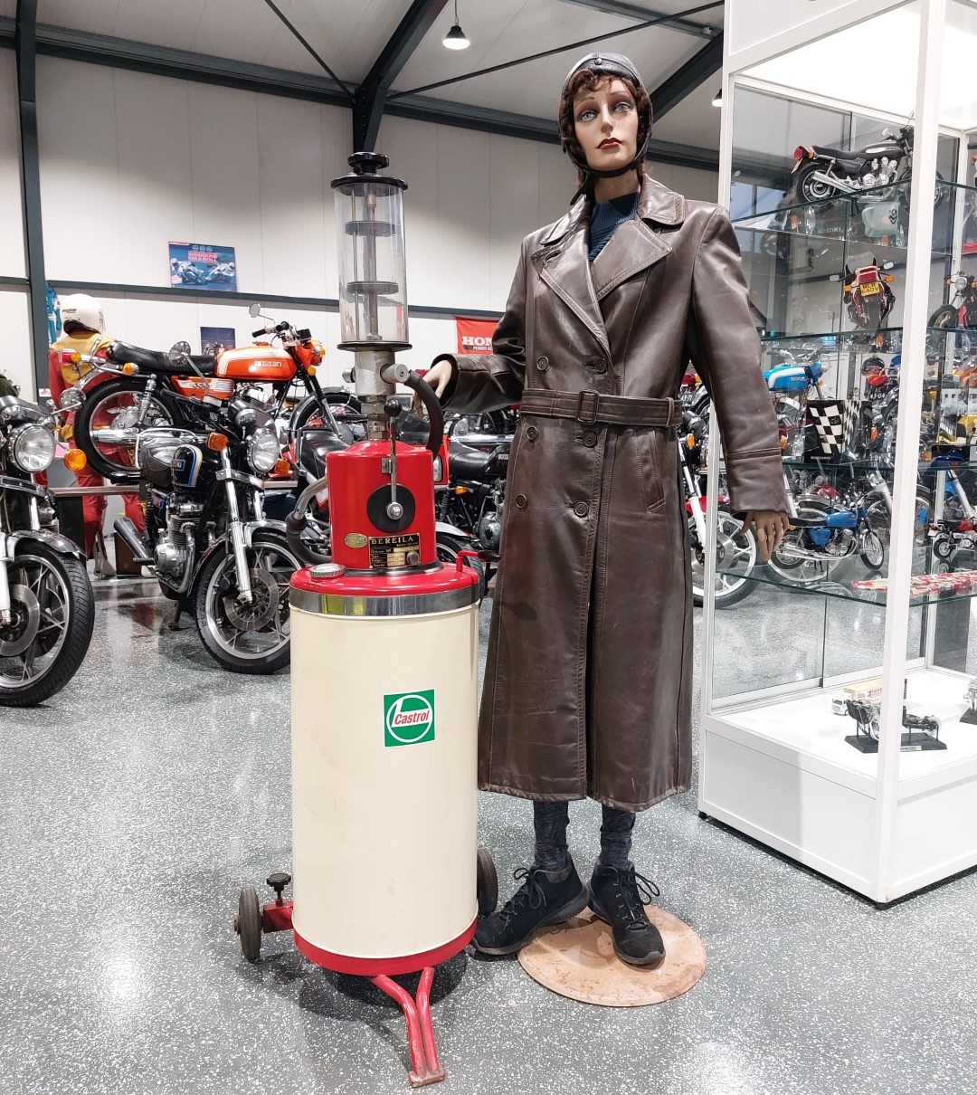 Ook stonden er zijspanmachines bij. Verder is het museum aangekleed met allerlei aanverwante zaken zoals legio foto’s van motoren brommers al dan niet met foto’s van renners en crossers er bij op. Wat er ook staan zijn de beroemde tweetakt benzine pompen met een tank en een maatglas er boven op. Veelal zijn die van het merk Bereila (BErghuis, REIneking en LAanstra.)