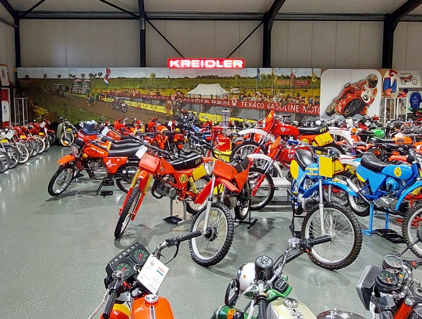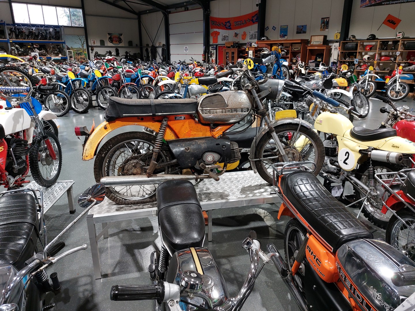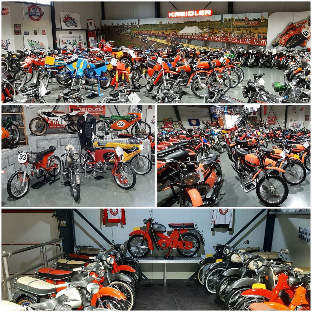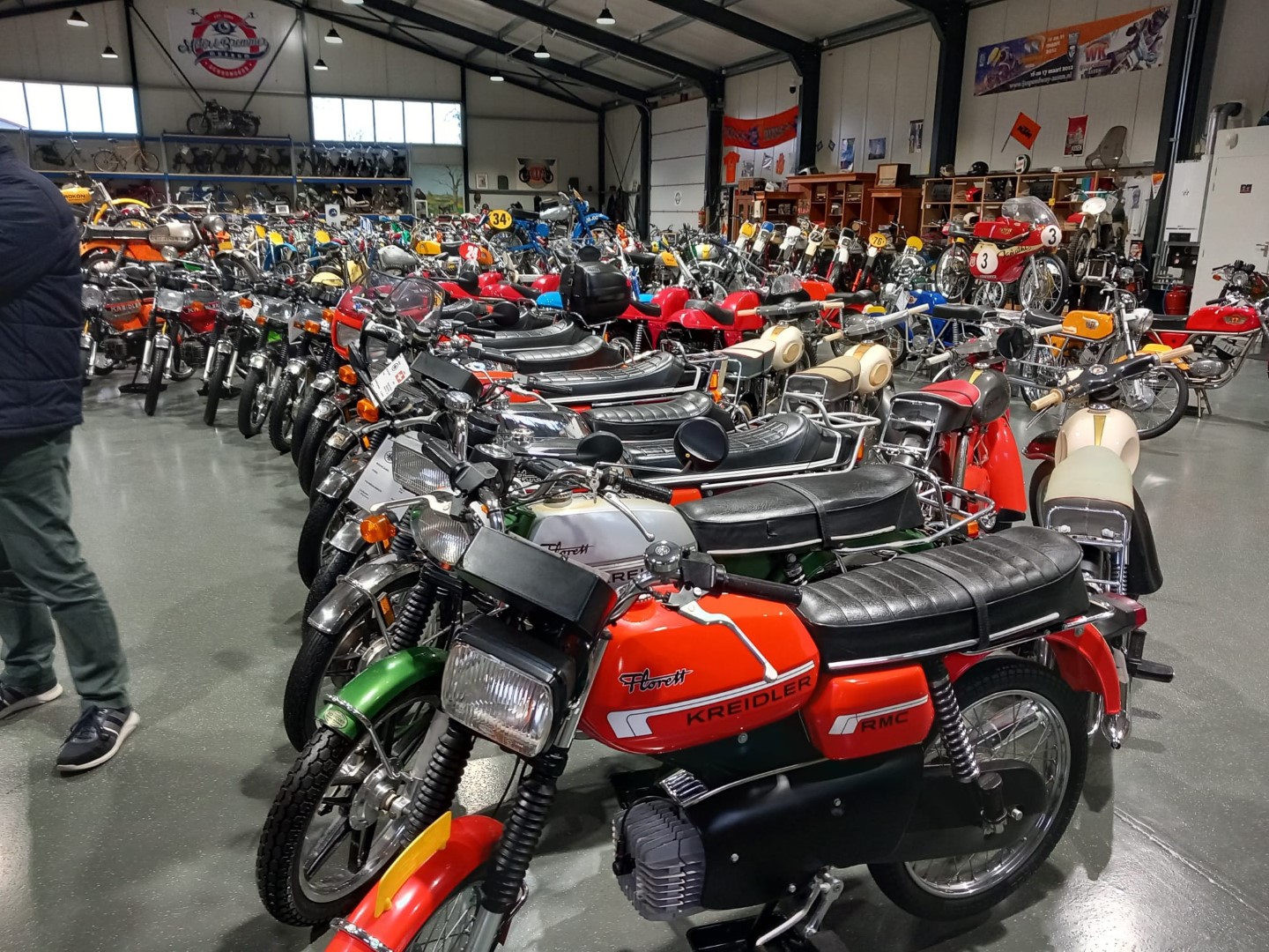 Toen kwamen we aan bij ons eigen merk: Kreidler. Louwrens heeft er een mooi aantal staan, keurig opgesteld in carrévorm. De meeste modellen stonden er en ook machines als