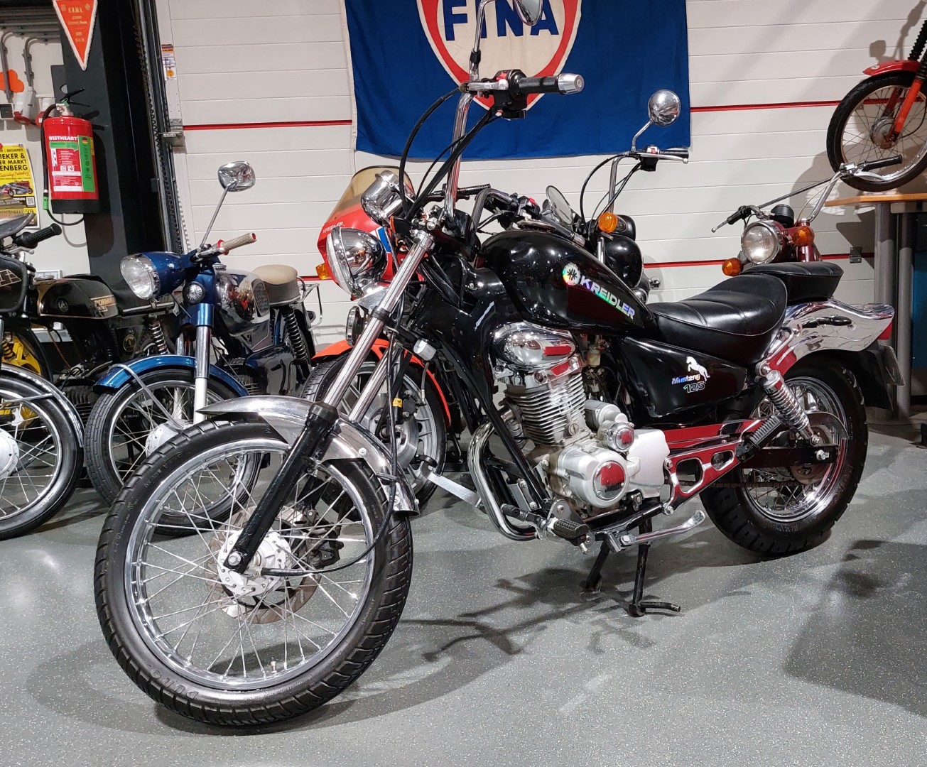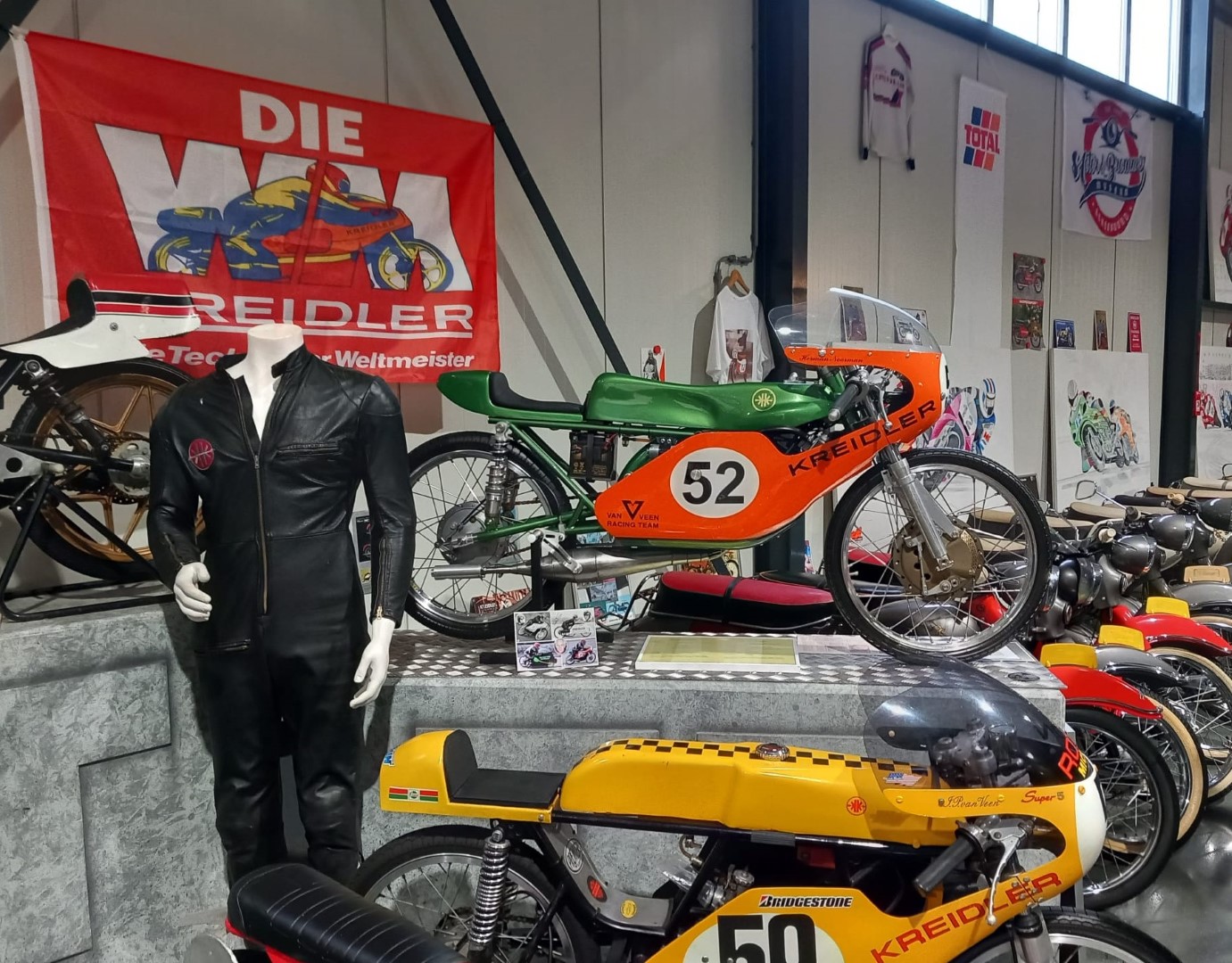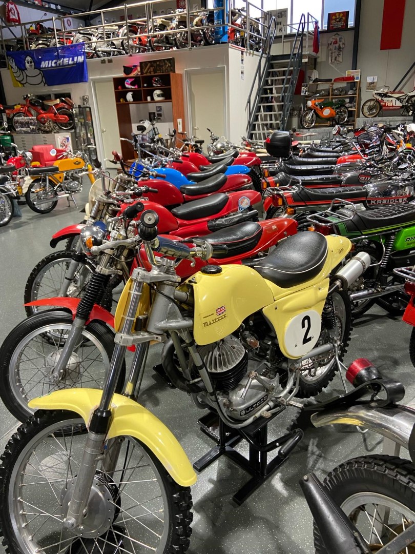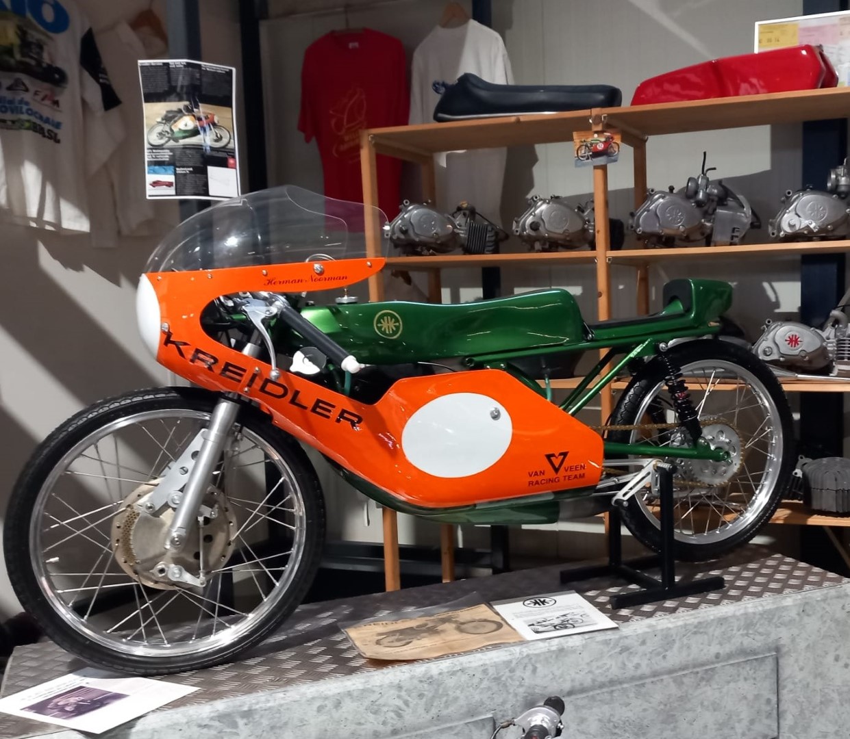 Toen kwamen we aan bij ons eigen merk: Kreidler. Louwrens heeft er een mooi aantal staan, keurig opgesteld in carrévorm. De meeste modellen stonden er en ook machines als