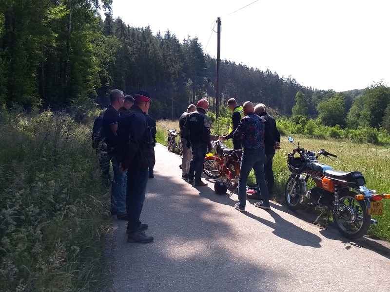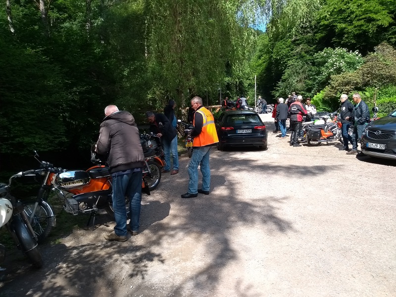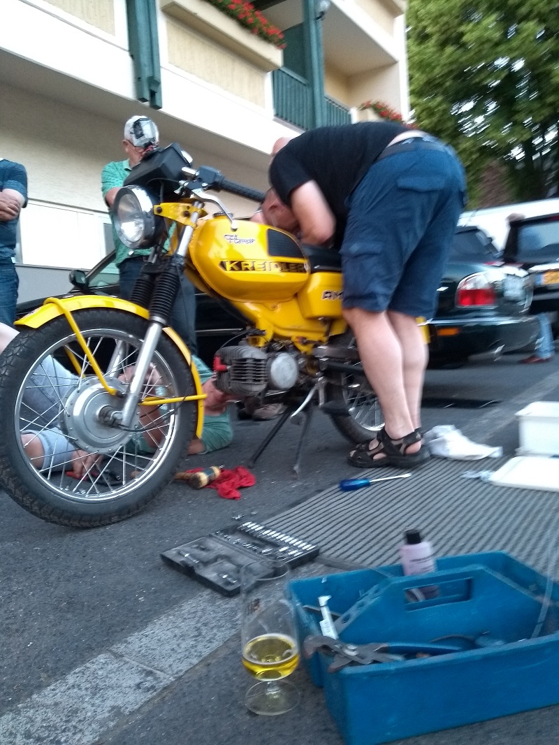 De opkomst met ca 26 deelnemers op een Kreidler (of iets wat er op lijkt!) en ook nog eens zo'n 16 dames die ook de smaak te pakken hebben van deze weekendjes, was formidabel. Het Hotel Brauer heeft zich van haar beste kant laten zien met prima slaapkamers, goed eten en drinken, fijne bediening en een uitstekende stalling voor onze kostbare tweewielers. het parkeren van de auto's met aanhanger was wel vrij krap (wij waren hiervan op de hoogte), maar met wat passen en meten is ook dit goed gelukt. Voor de 2e avond was er een meer dan uitstekende barbecue bij de "Alte Weinstube" ietsje verderop, achter het hotel. Al met al een goed onderkomen voor deze 4 dagen en zo goed, dat het voor het komend jaar ook reeds is geboekt.