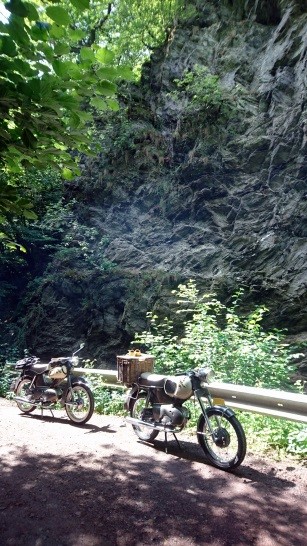 Dit vergt stuurmanskunst. Wij hielden het echter op een meer gereserveerd tempo, domweg omdat hier veel te zien is en onze brommers niet zo hard gaan.De brommerrijders hielden hun eerste pauze bij restaurant Schmausemühle.
