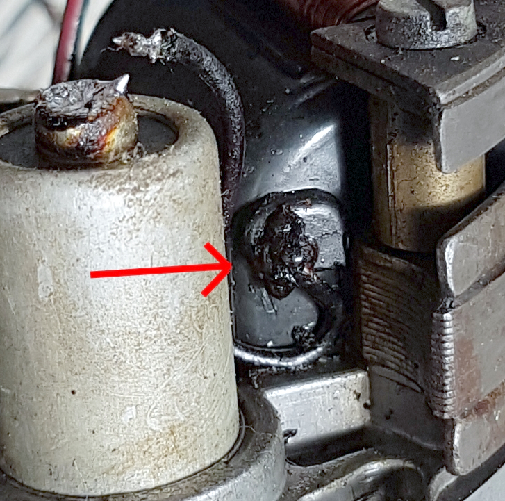 Na een paar dagen heb ik de ontsteking er afgehaald en geconstateerd dat bij het draadje uit de ontstekingsspoel naar de condensator een soort zwarte ,,teer,, bolletjes gekomen waren.