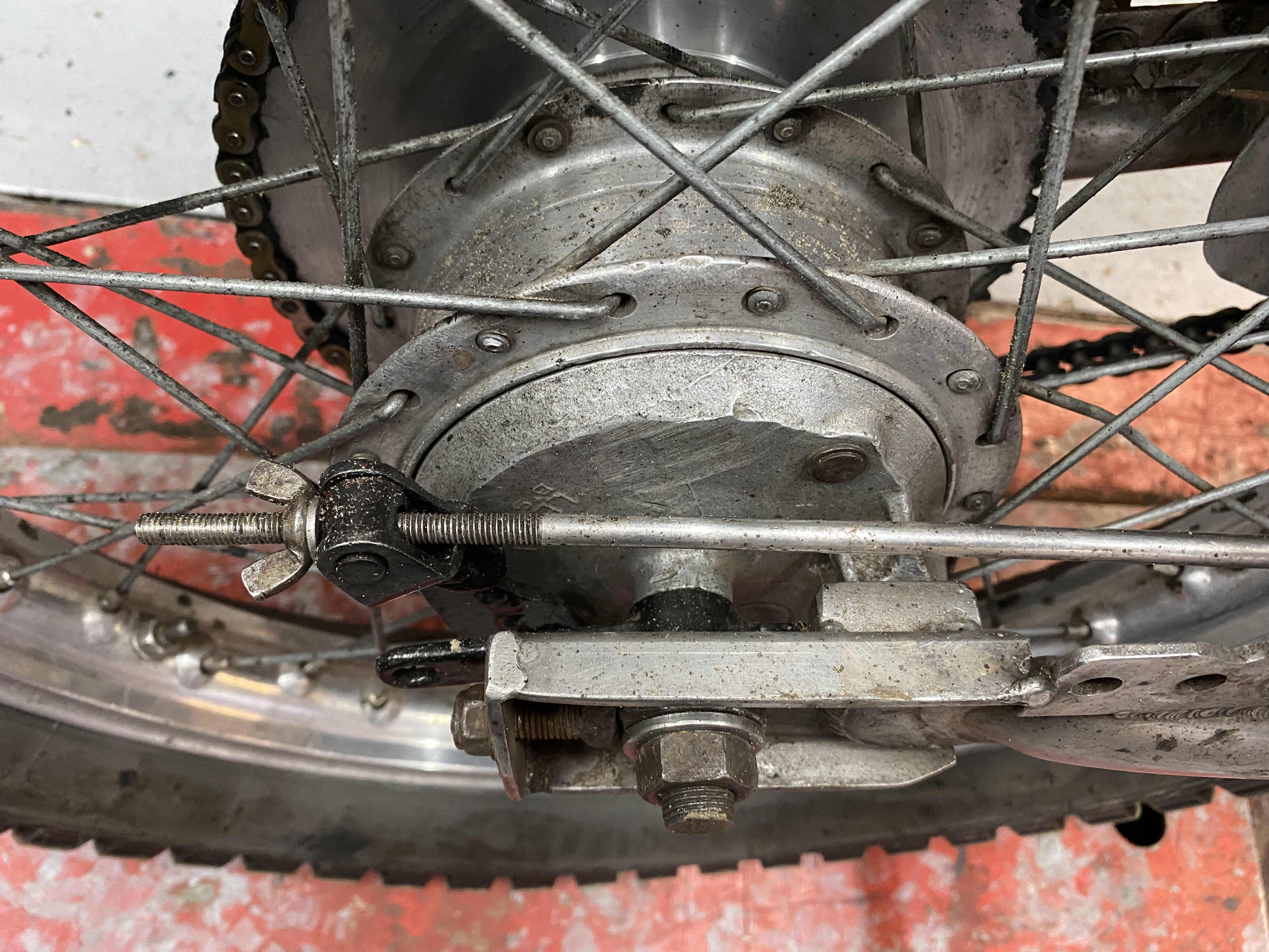 Rechter achterbrug met remconstructie ook de afgedraaide naaf is te zien