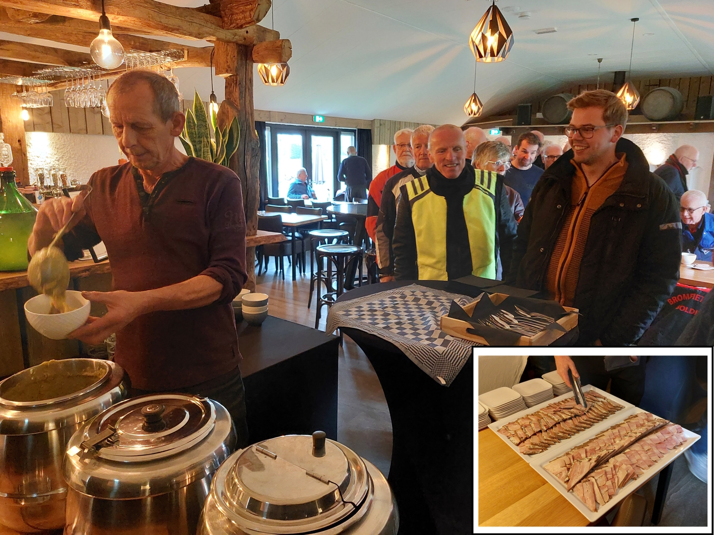 Toen naar binnen waar de pan met snert en roggebrood met spek klaar stonden. We lieten het ons goed smaken.