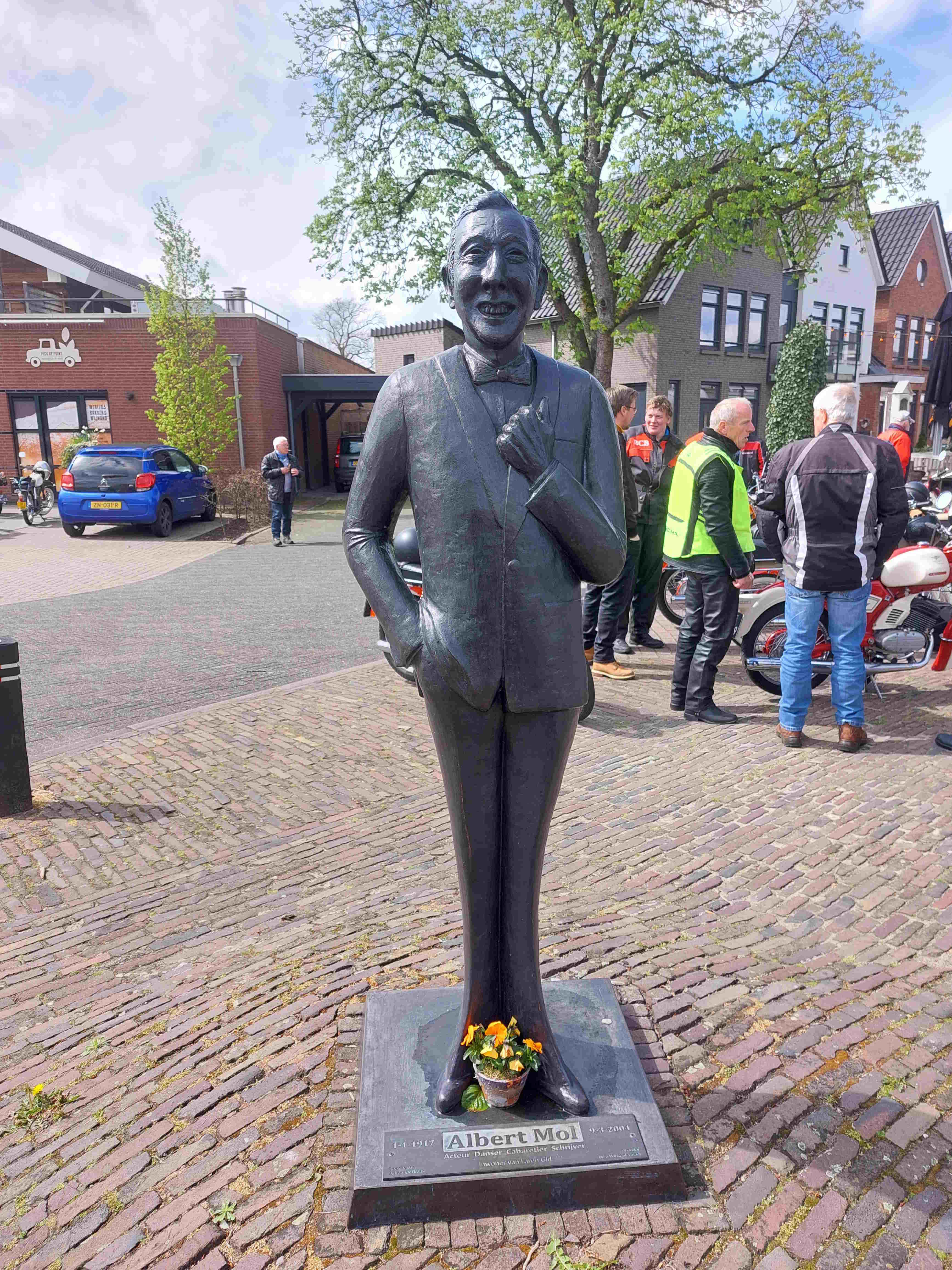 Buiten op het terras stond een uiterst fraai standbeeld van wijlen Albert Mol. Deze heeft een gedeelte van zijn leven in Laren gewoond. Na een dik uur hebben we onze machines weer aangetrapt en ging het richting Lochem. Hier kwamen we nog langs de machine fabriek Wila. Deze ken ik nog uit de periode dat ik werkte. Ze maken er kantbanken. Dit zijn machines waar je