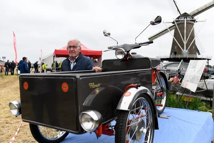 Snijders heeft misschien wel de meest bijzondere Kreidler van het treffen in Neede: een Florett-bakbromfiets. Zelf opgebouwd, zegt hij trots, als hij naar de glimmende, rode bakbrommer met drie wielen wijst. Tijdens de coronatijd gemaakt. Kijk, de bak draait niet mee als je stuurt. Alleen de twee voorwielen.